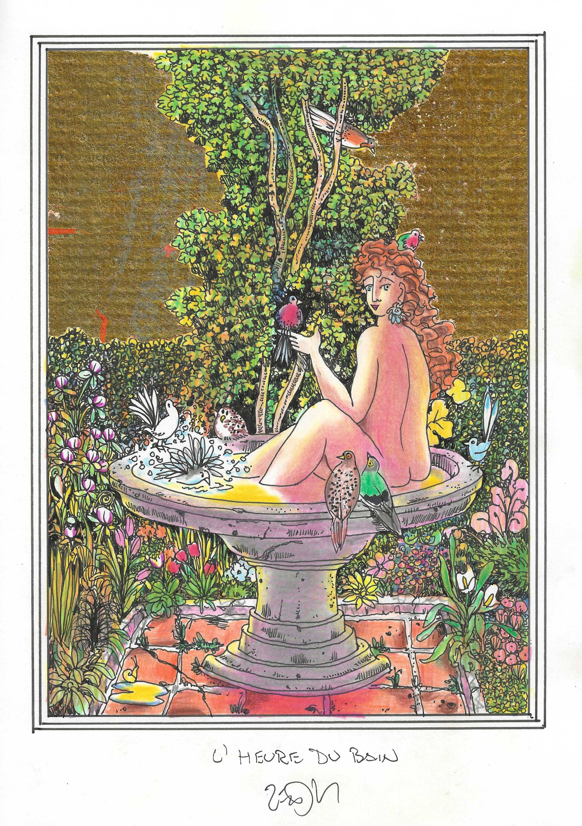 Drawing of the Day – 3017 – Dessin du jour « Bathtime – L’heure du bain » Mixed Media on Paper – 8 x 12″ (21 x 30 cm) – Technique mixte sur Papier