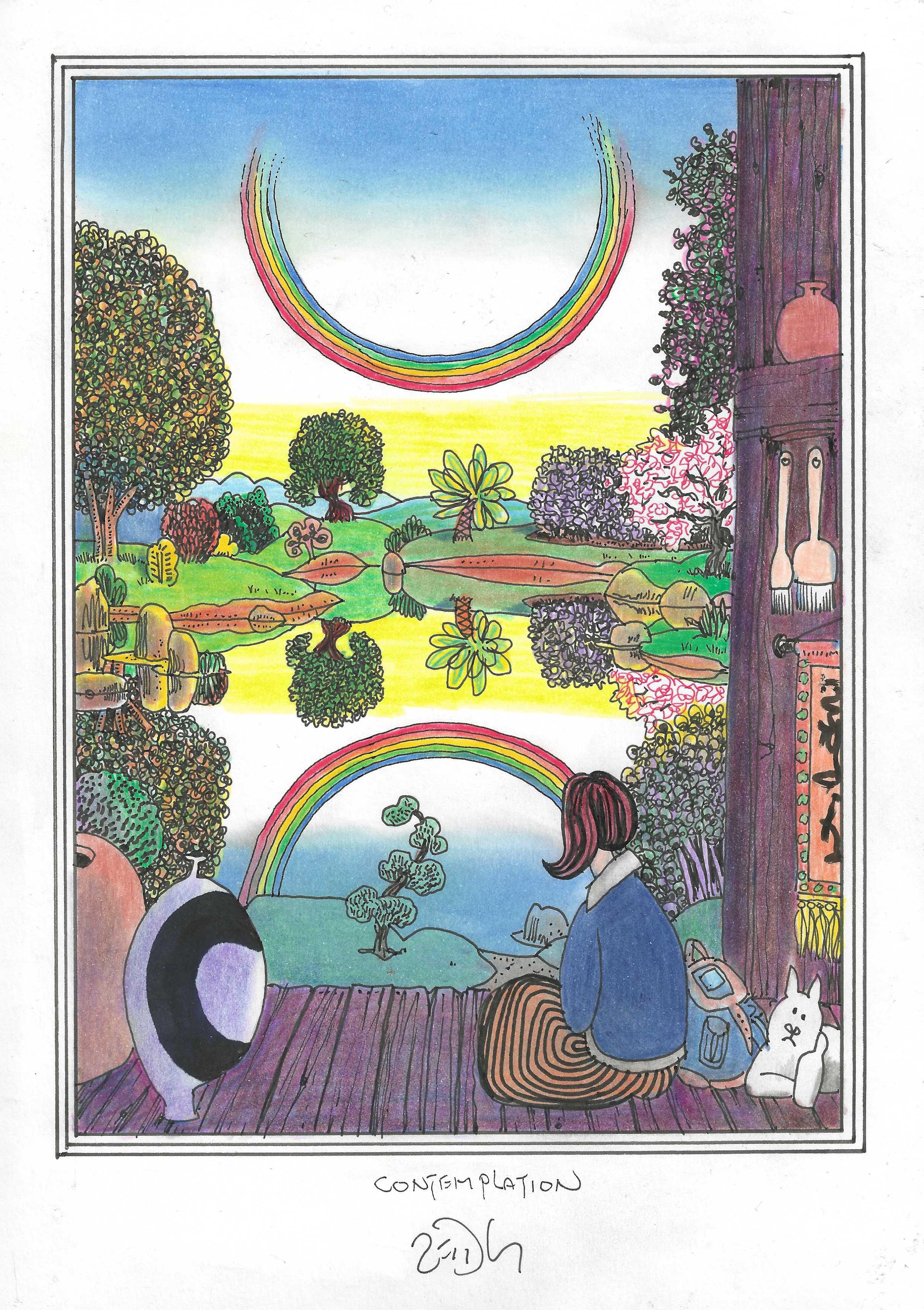 Drawing of the Day – 3018 – Dessin du jour « Contemplation » Ink & colour on Paper – 8 x 12″ (21 x 30 cm) – Encre & couleurs sur Papier