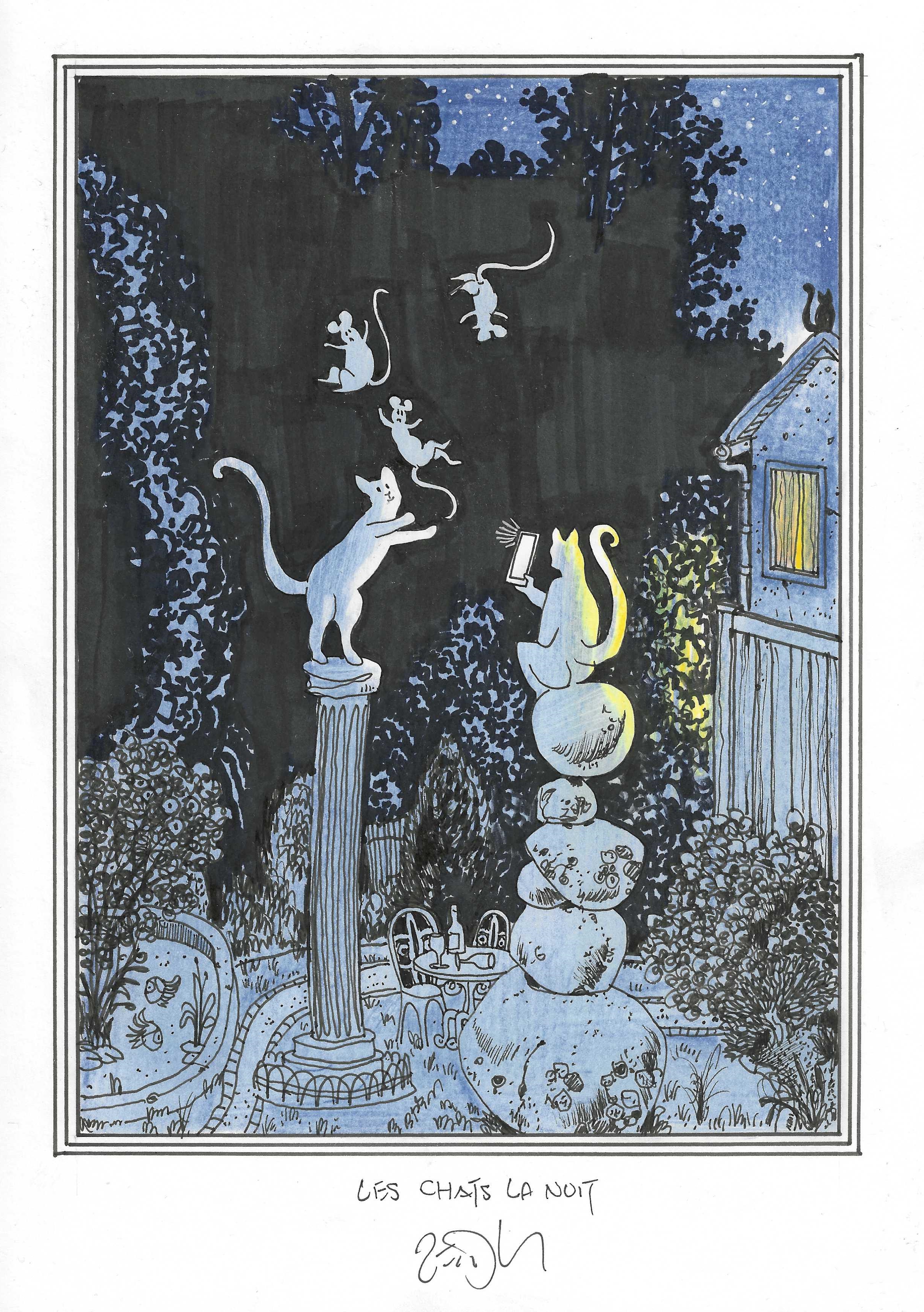 Drawing of the Day – 3019 – Dessin du jour « Cats at night – Les chats la nuit » Ink & colour on Paper – 8 x 12″ (21 x 30 cm) – Encre & couleurs sur Papier
