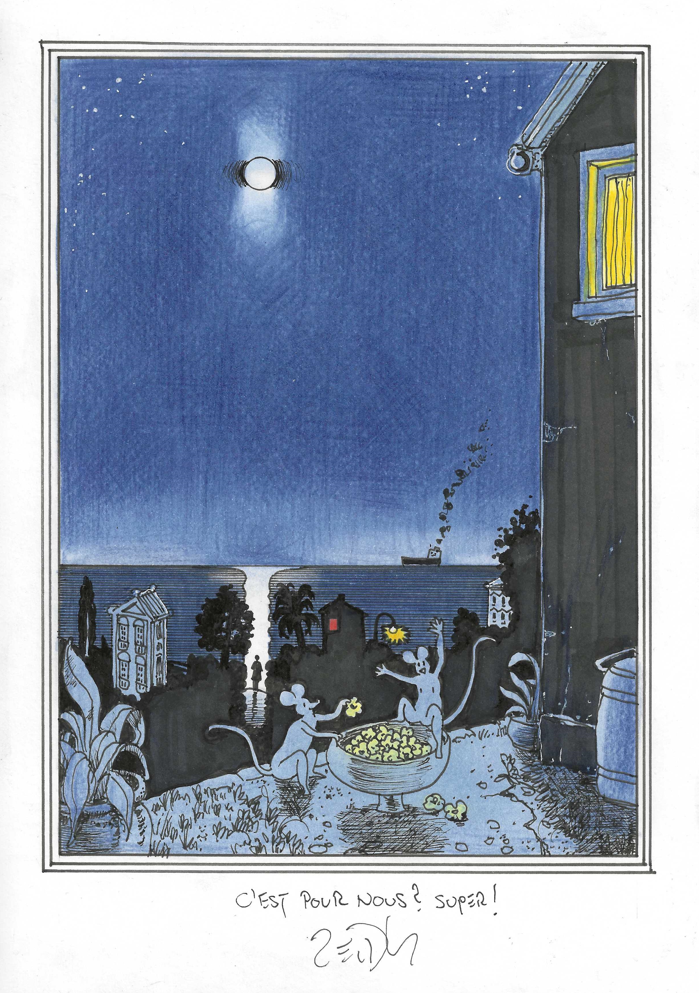Drawing of the Day – 3026 – Dessin du jour « The call of the moon – L’appel de la lune » Ink & colour on Paper – 8 x 12″ (21 x 30 cm) – Encre & couleurs sur Papier