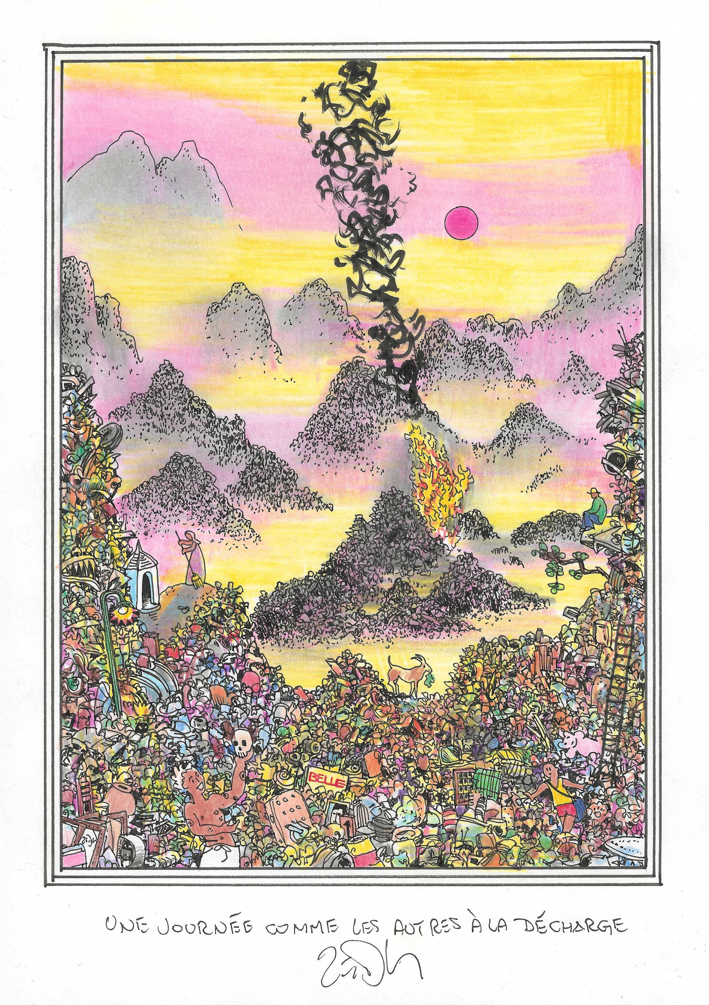 Drawing of the Day – 3023 – Dessin du jour « Just another day at the dump – Une journée comme les autres à la décharge » Ink & colour on Paper – 8 x 12″ (21 x 30 cm) – Encre & couleurs sur Papier
