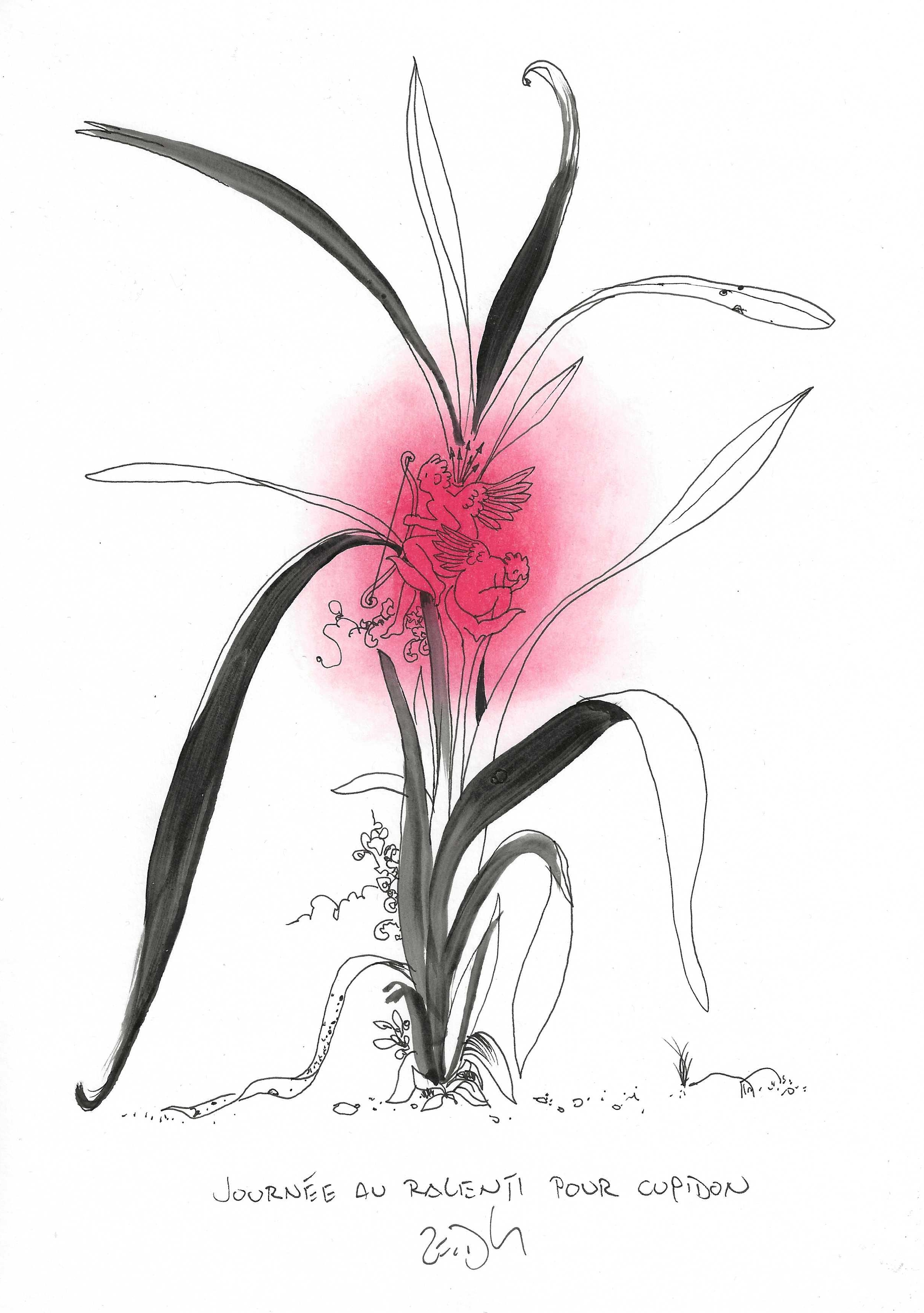 Drawing of the Day – 3025 – Dessin du jour « Slow day for Cupid – Journée au ralenti pour Cupidon » Ink & colour on Paper – 8 x 12″ (21 x 30 cm) – Encre & couleurs sur Papier
