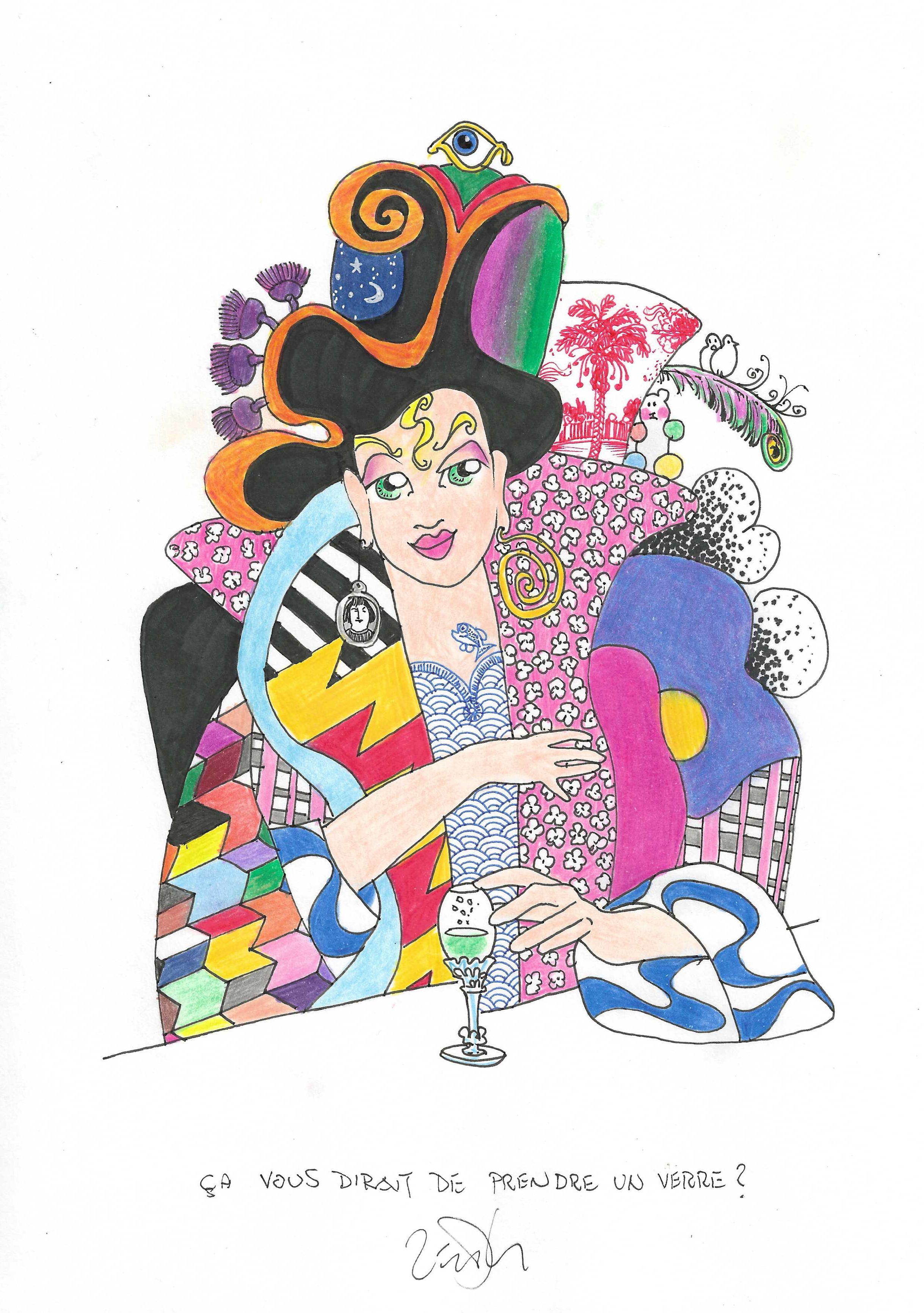 Drawing of the Day – 3008 – Dessin du jour « Fancy a drink ? – Ça vous dirait de prendre un verre ? » Ink & colour on Paper – 8 x 12″ (21 x 30 cm) – Encre & couleurs sur Papier