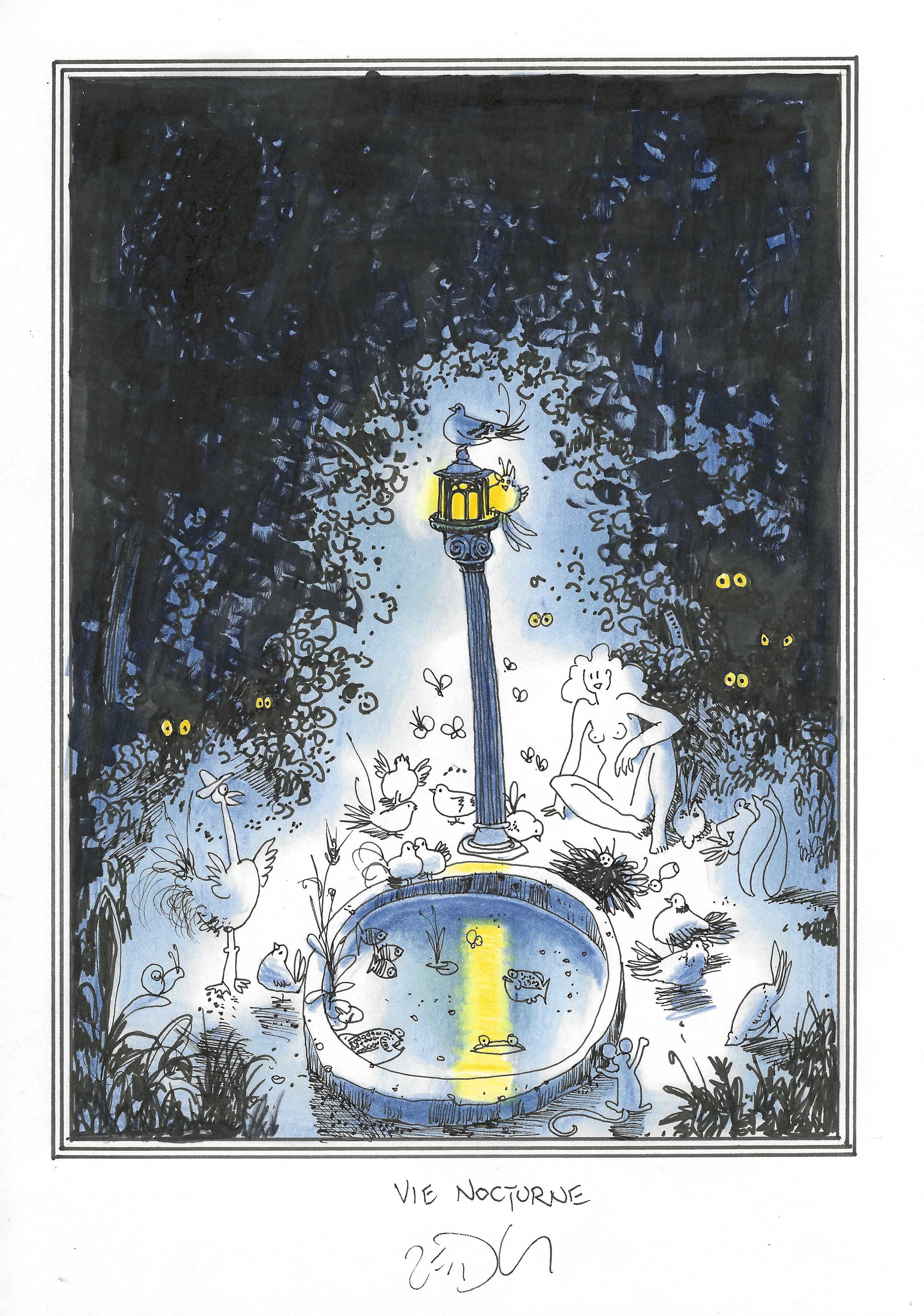 Drawing of the Day – 3010 – Dessin du jour « Nightlife – Vie nocturne » Ink & colour on Paper – 8 x 12″ (21 x 30 cm) – Encre & couleurs sur Papier