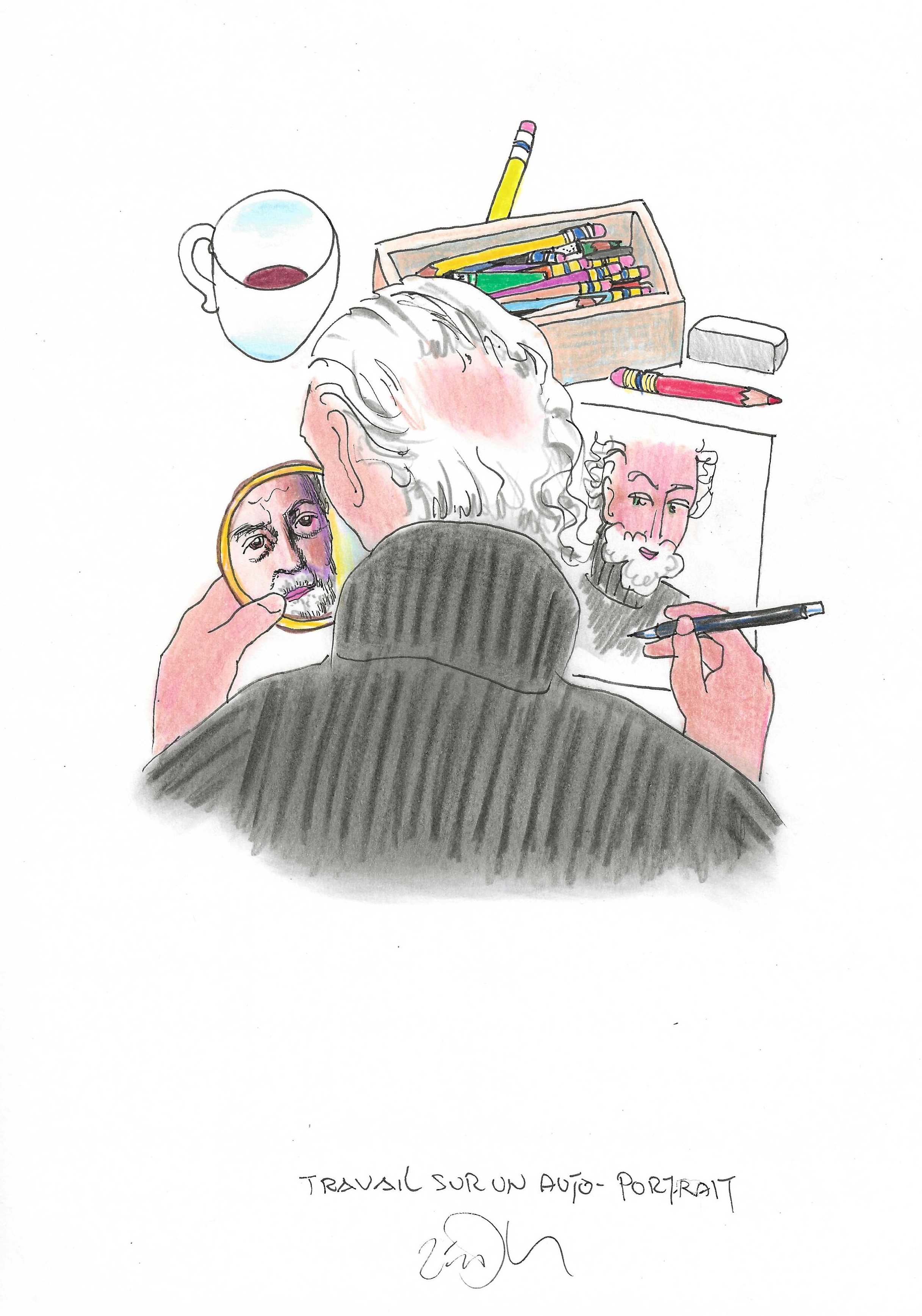 Drawing of the Day – 3013 – Dessin du jour « Working on a self portrait – Travail sur un auto-portrait » Ink & colour on Paper – 8 x 12″ (21 x 30 cm) – Encre & couleurs sur Papier