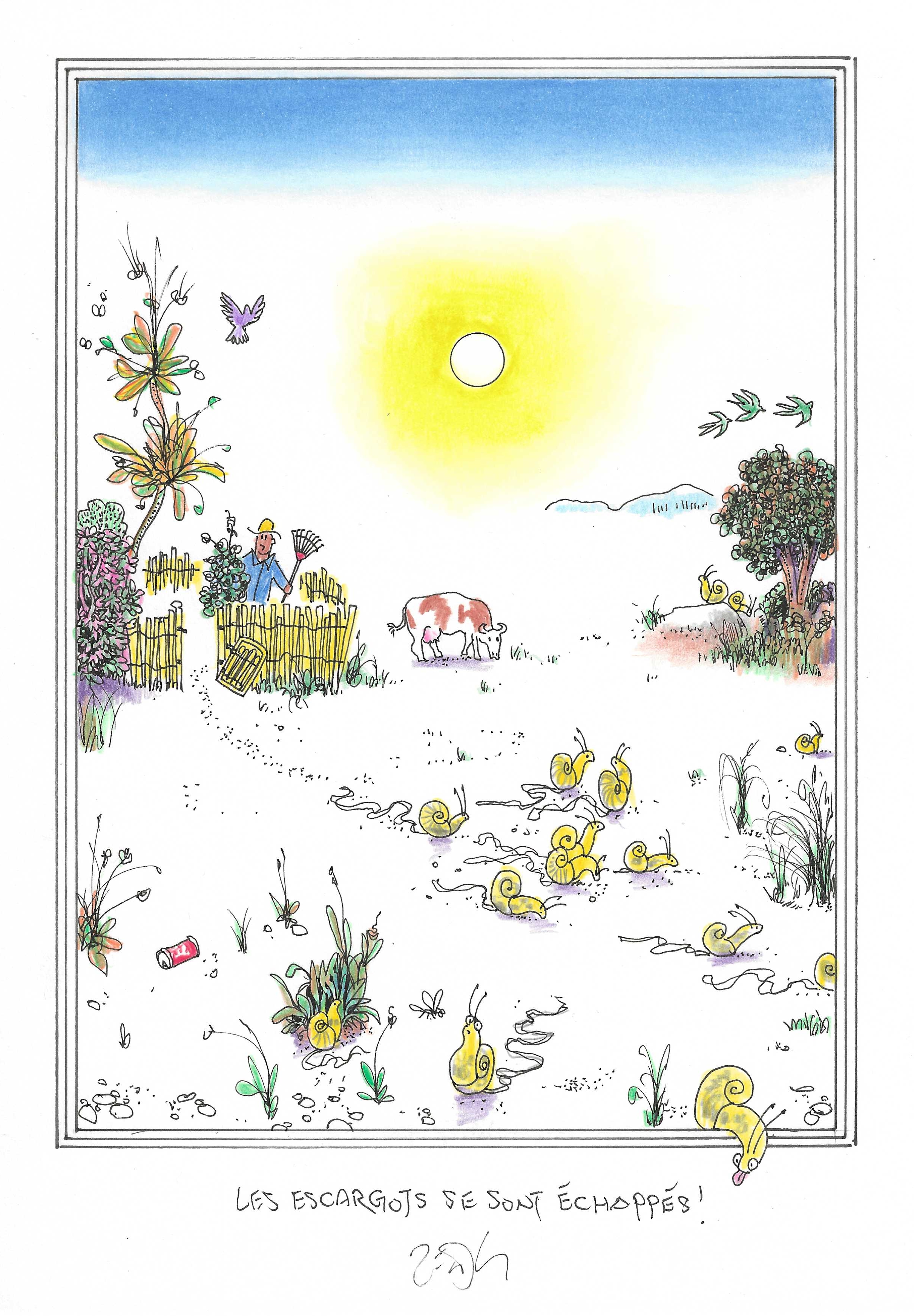 Drawing of the Day – 3014 – Dessin du jour « The snails have escaped ! – Les escargots se sont échappés ! » Ink & colour on Paper – 8 x 12″ (21 x 30 cm) – Encre & couleurs sur Papier