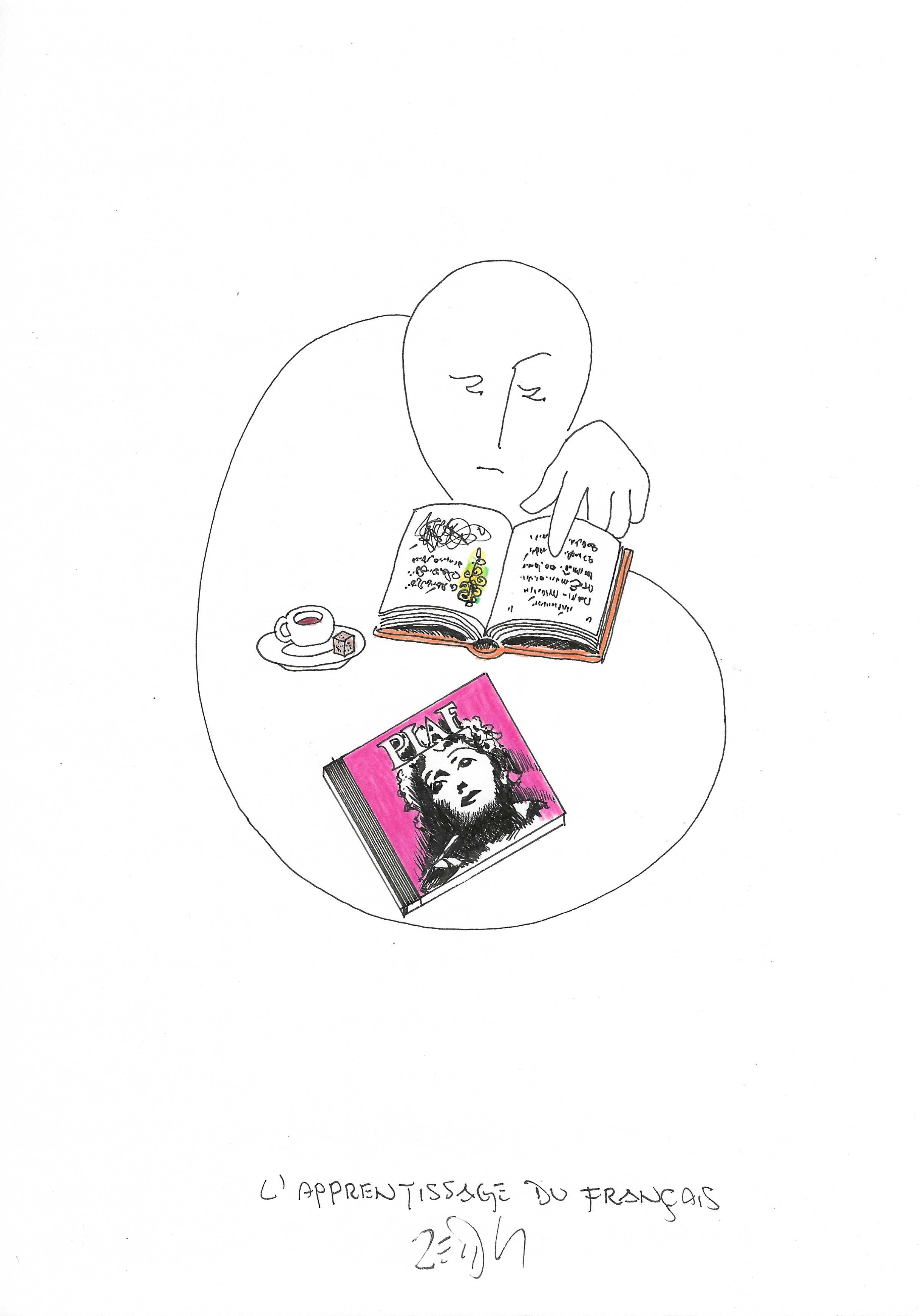 Drawing of the Day – 3015 – Dessin du jour « Learning French – L’apprentissage du Français » Ink & colour on Paper – 8 x 12″ (21 x 30 cm) – Encre & couleurs sur Papier