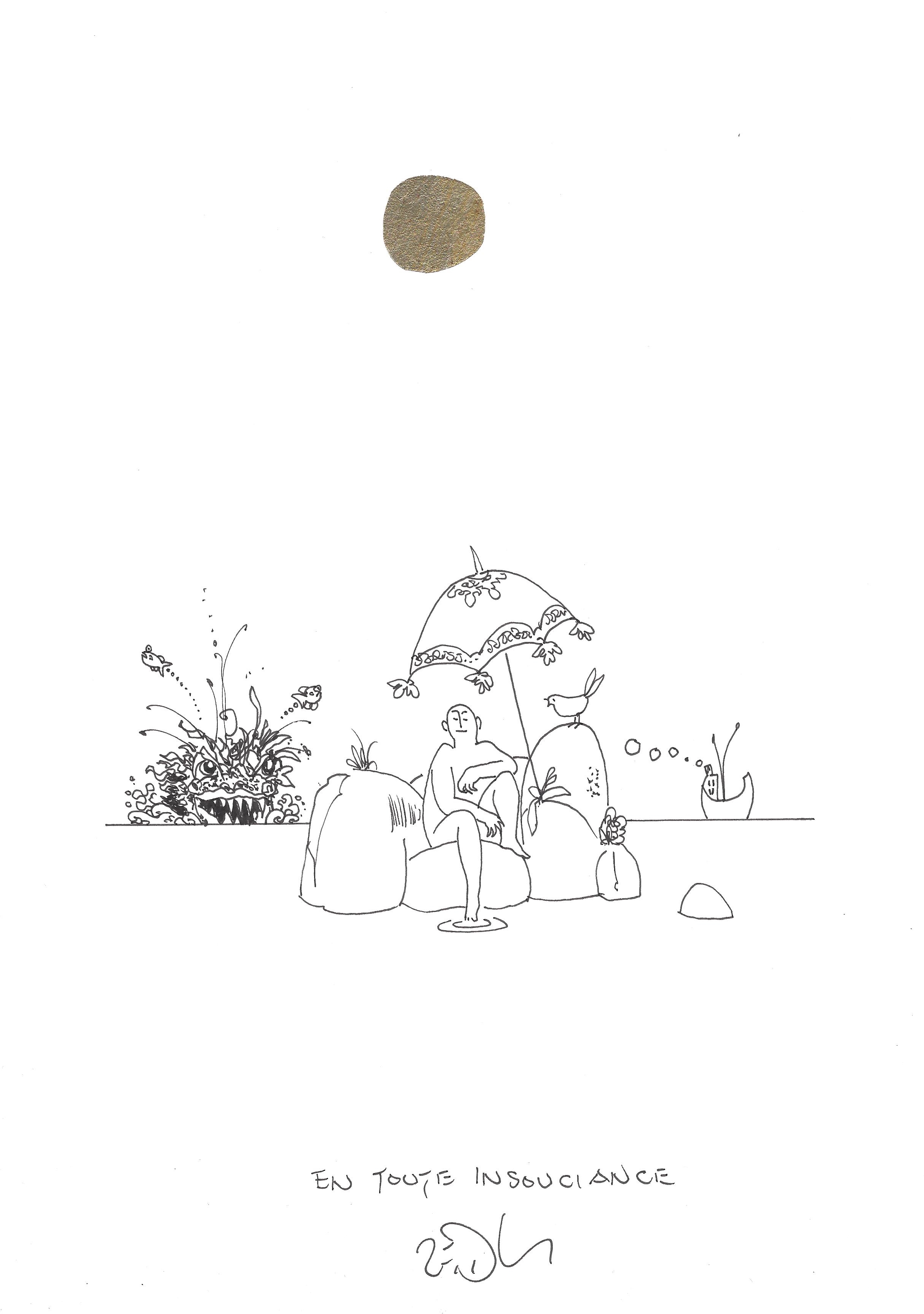Drawing of the Day – 2979 – Dessin du jour « Oblivious – En toute insouciance » Mixed Media on Paper – 8 x 12″ (21 x 30 cm) – Technique mixte sur Papier