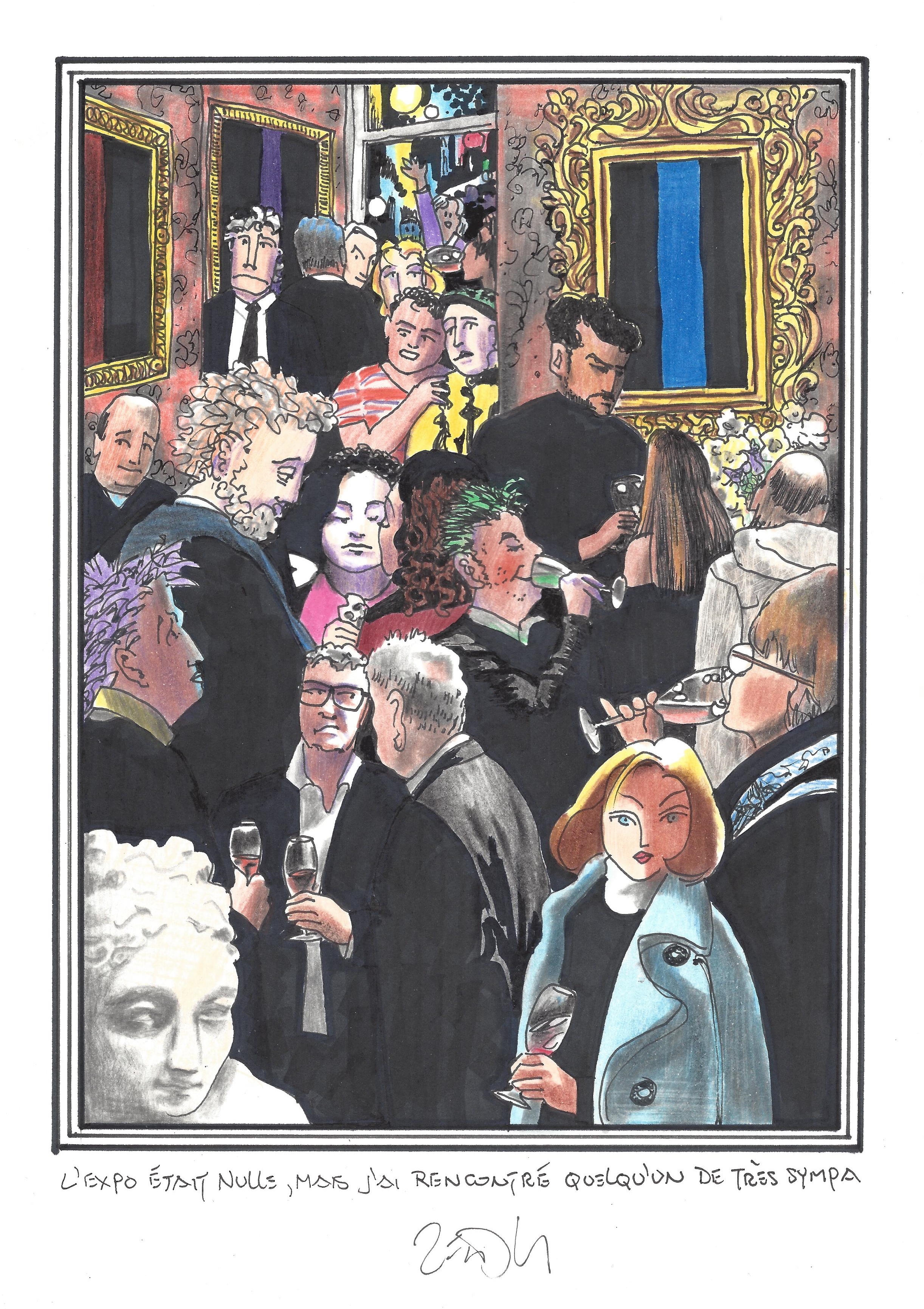 Drawing of the Day – 2980 – Dessin du jour « The show was a flop, but I did meet someone really nice – L’expo était nulle mais j’ai rencontré quelqu’un de très sympa » Ink & colour on Paper – 8 x 12″ (21 x 30 cm) – Encre & couleurs sur Papier