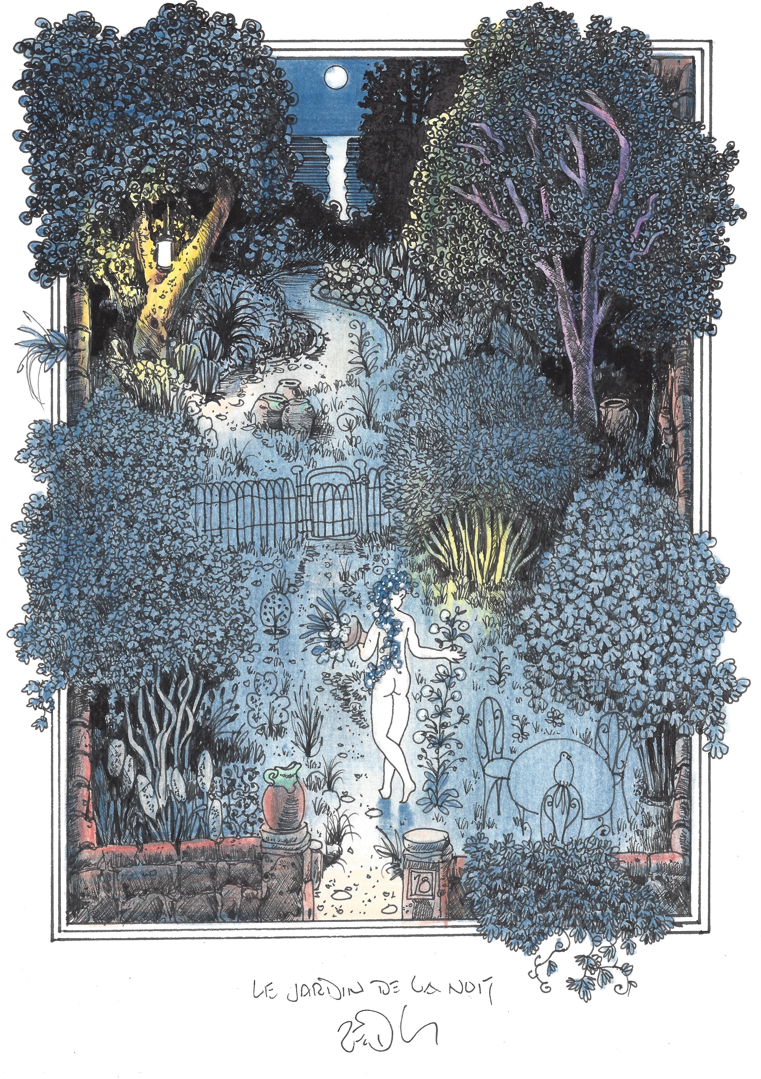 Drawing of the Day – 2982 – Dessin du jour « The night garden – Le jardin de la nuit » Ink & colour on Paper – 8 x 12″ (21 x 30 cm) – Encre & couleurs sur Papier