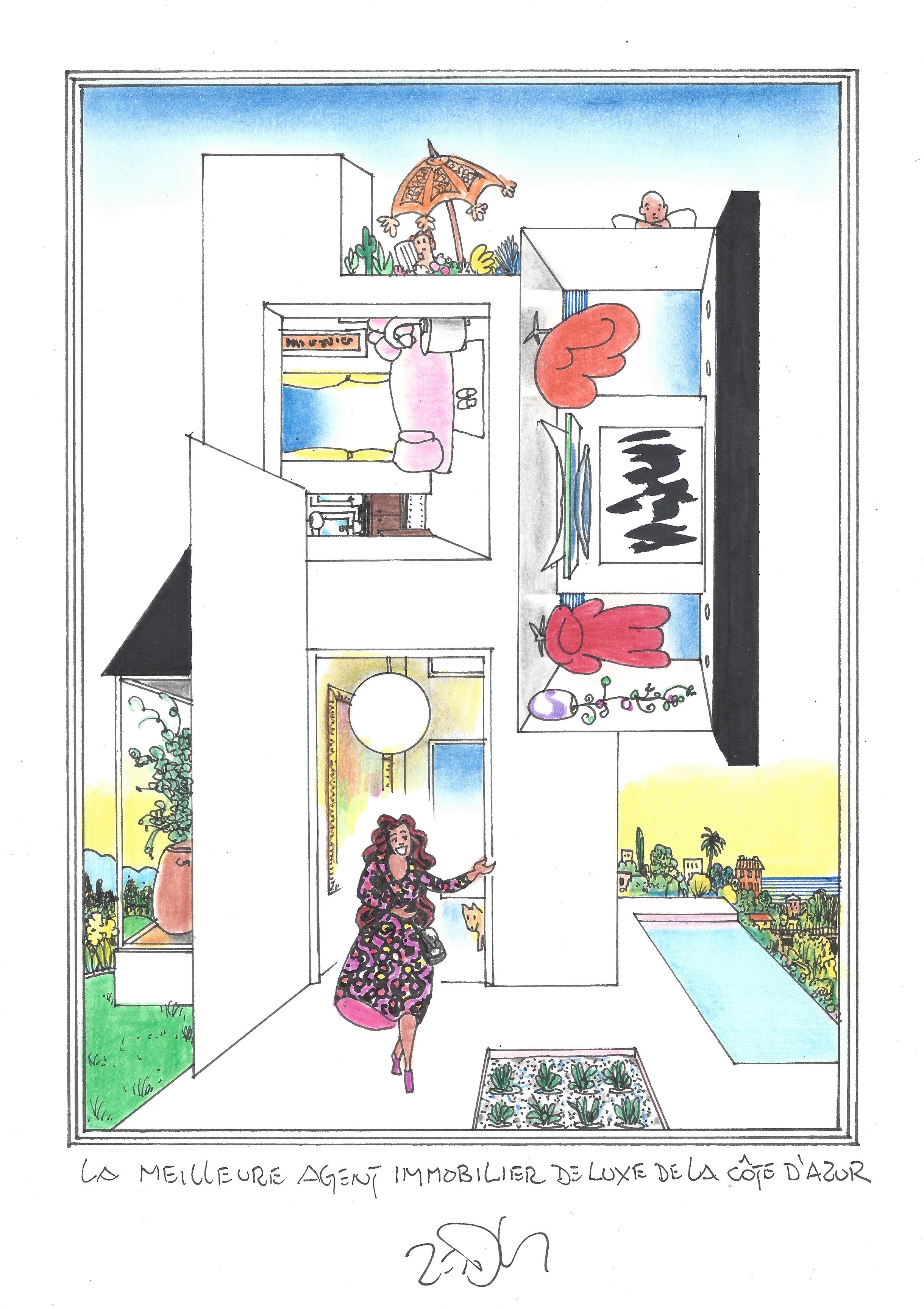 Drawing of the Day – 2983 – Dessin du jour « Top agent Riviera luxury real estate – La meilleure agent immobilier de luxe de la côte d’Azur » Ink & colour on Paper – 8 x 12″ (21 x 30 cm) – Encre & couleurs sur Papier