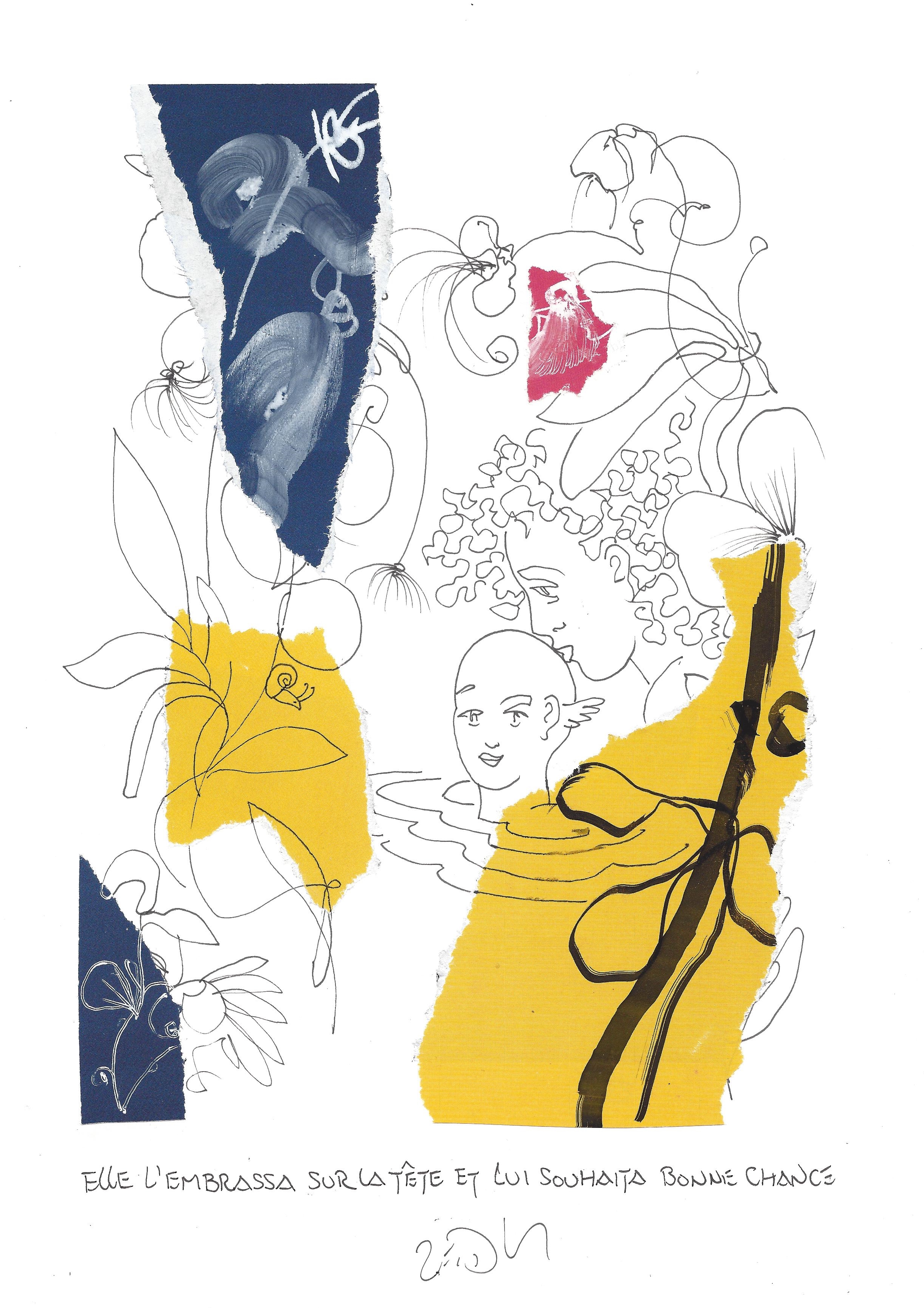 Drawing of the Day – 2968 – Dessin du jour « She kissed his head and wished him well – Elle l’embrassa sur la tête et lui souhaita bonne chance » Mixed Media on Paper – 8 x 12″ (21 x 30 cm) – Technique mixte sur Papier