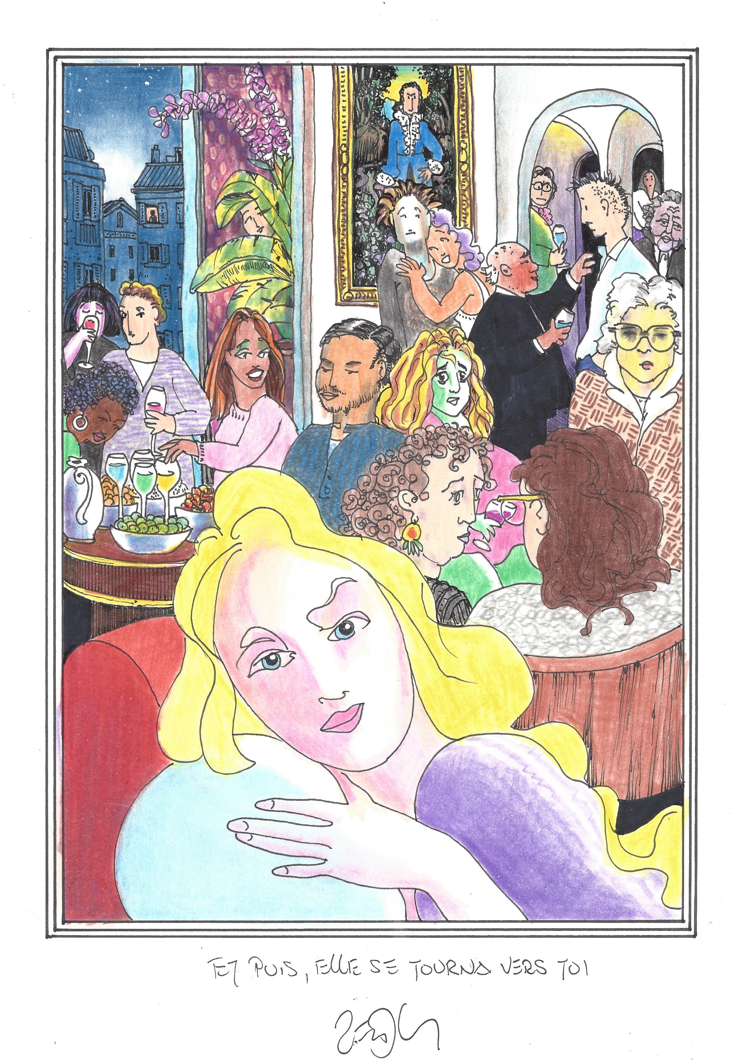 Drawing of the Day – 2970 – Dessin du jour « And then she turned towards you – Et puis, elle se tourna vers toi » Ink & colour on Paper – 8 x 12″ (21 x 30 cm) – Encre & couleurs sur Papier