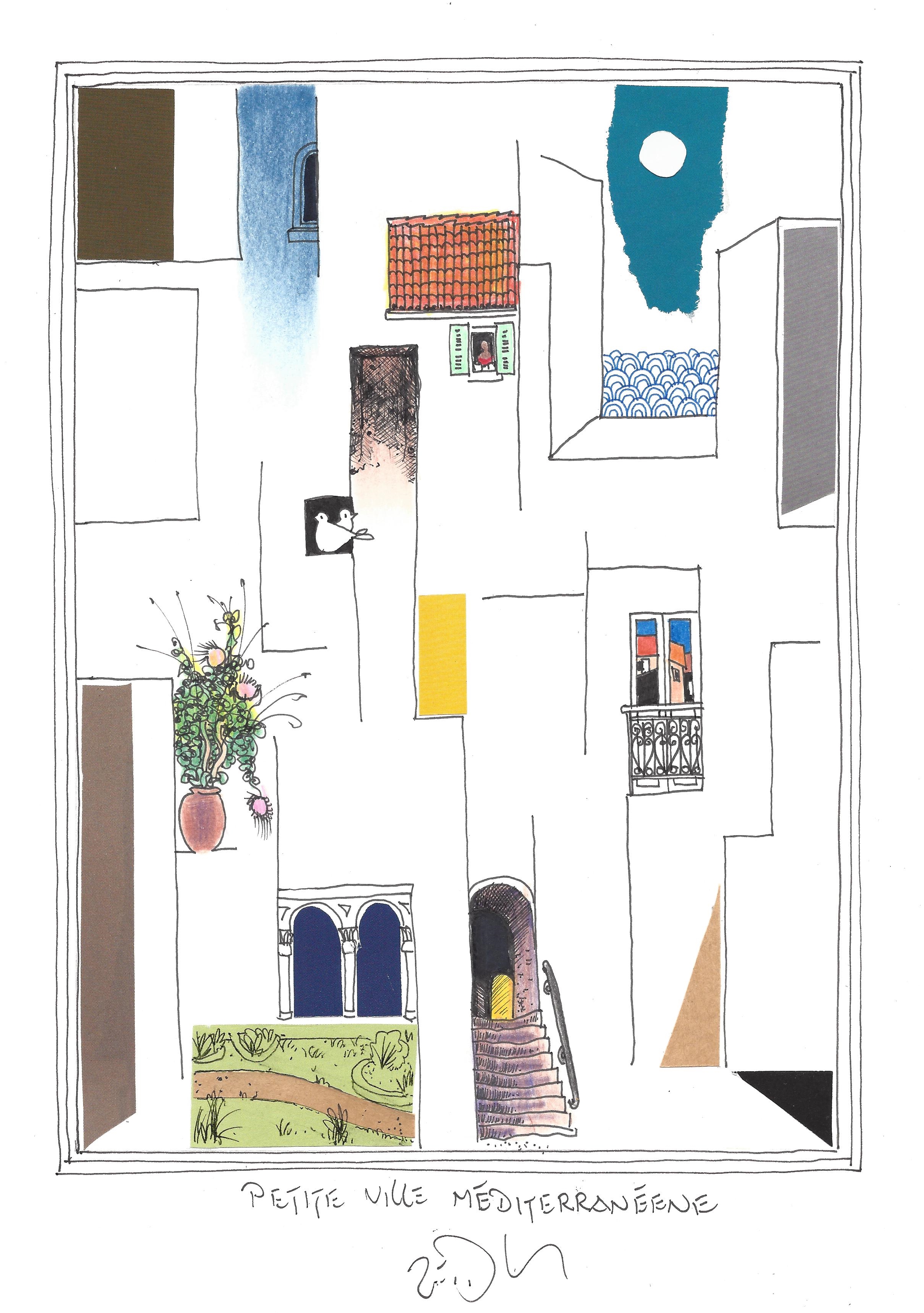 Drawing of the Day – 2972 – Dessin du jour « Small mediterranean town – Petite ville méditerranéenne » Mixed Media on Paper – 8 x 12″ (21 x 30 cm) – Technique mixte sur Papier