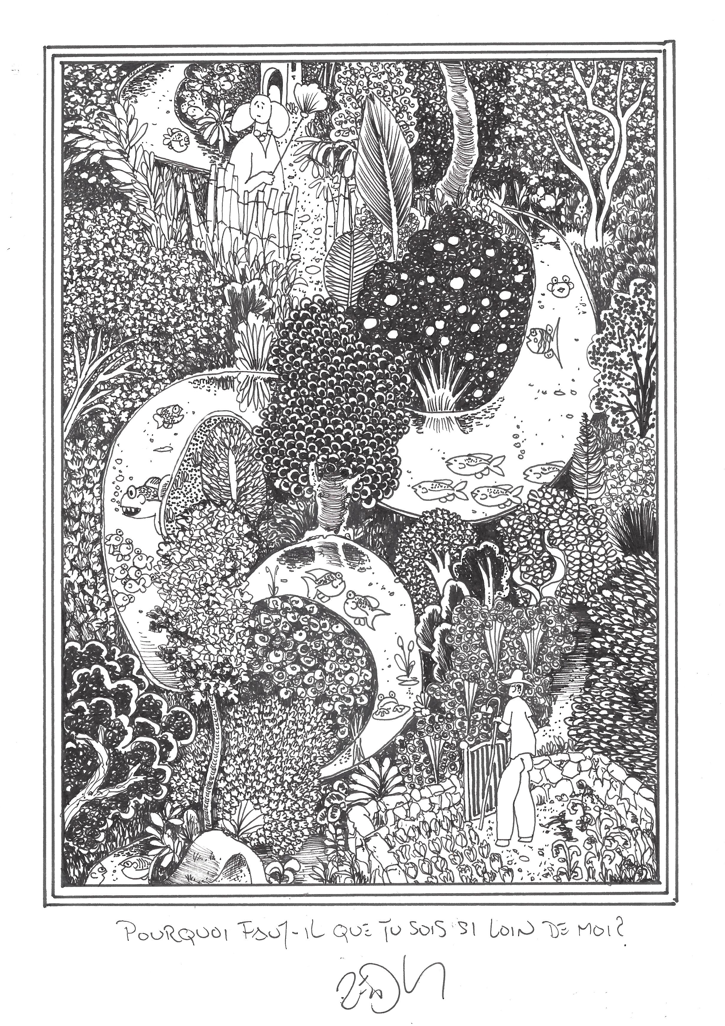 Drawing of the Day – 2974 – Dessin du jour « Why must you be so far from me ? – Pourquoi faut-il que tu sois si loin de moi ? » Ink on Paper – 8 x 12″ (21 x 30 cm) – Encre sur Papier