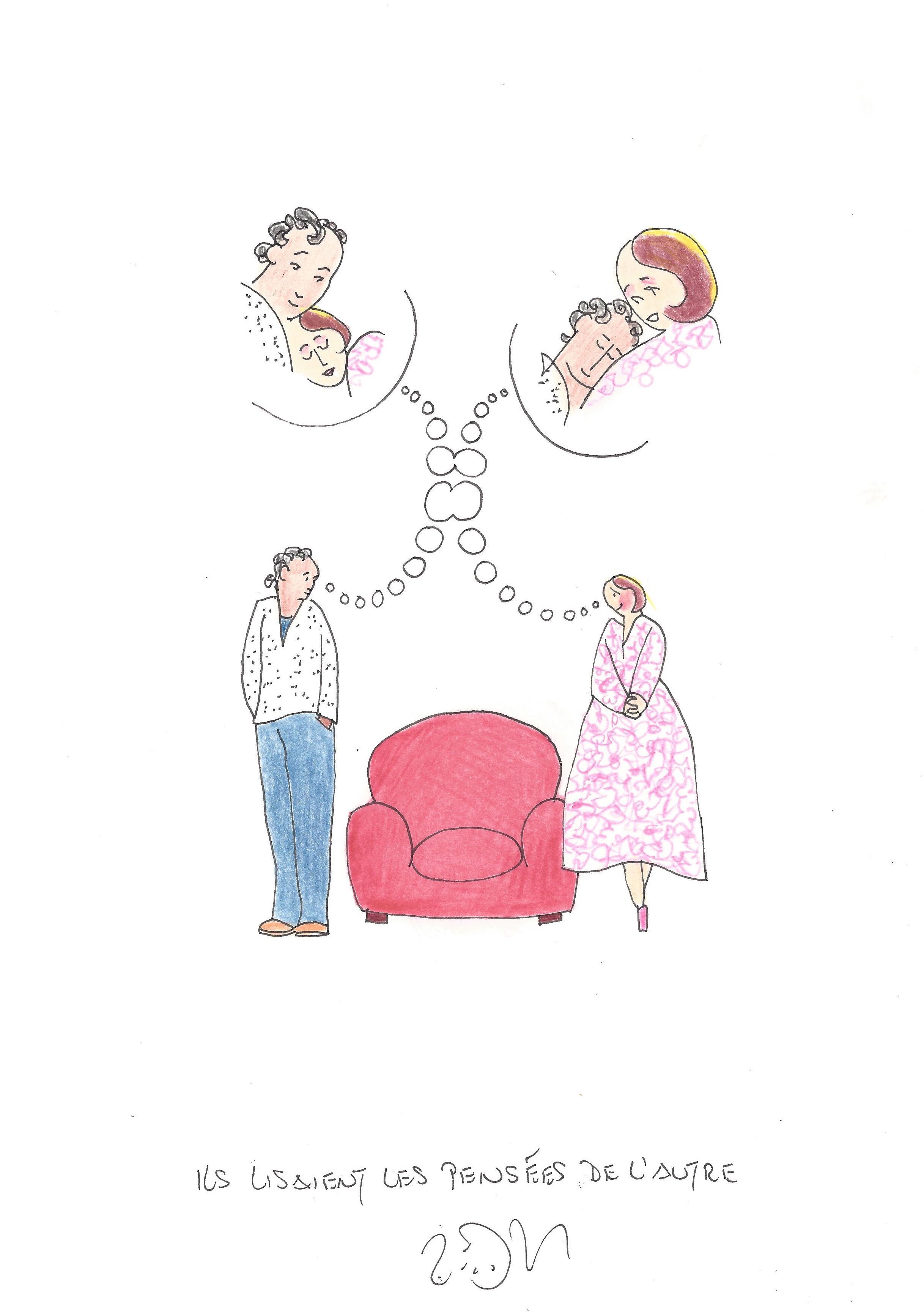 Drawing of the Day – 2975 – Dessin du jour « They read each other’s minds – Ils lisaient les pensées de l’autre » Ink & colour on Paper – 8 x 12″ (21 x 30 cm) – Encre & couleurs sur Papier
