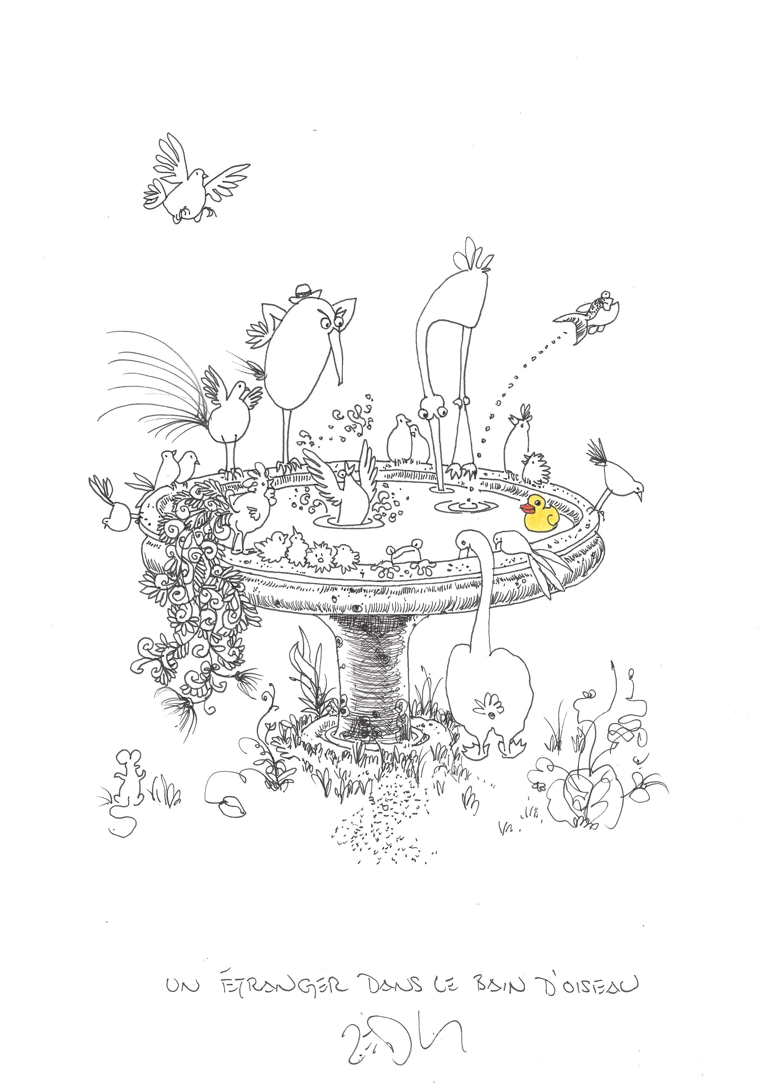 Drawing of the Day – 2976 – Dessin du jour « Outsider in the birdbath – Un étranger dans le bain d’oiseau » Ink & colour on Paper – 8 x 12″ (21 x 30 cm) – Encre & couleurs sur Papier