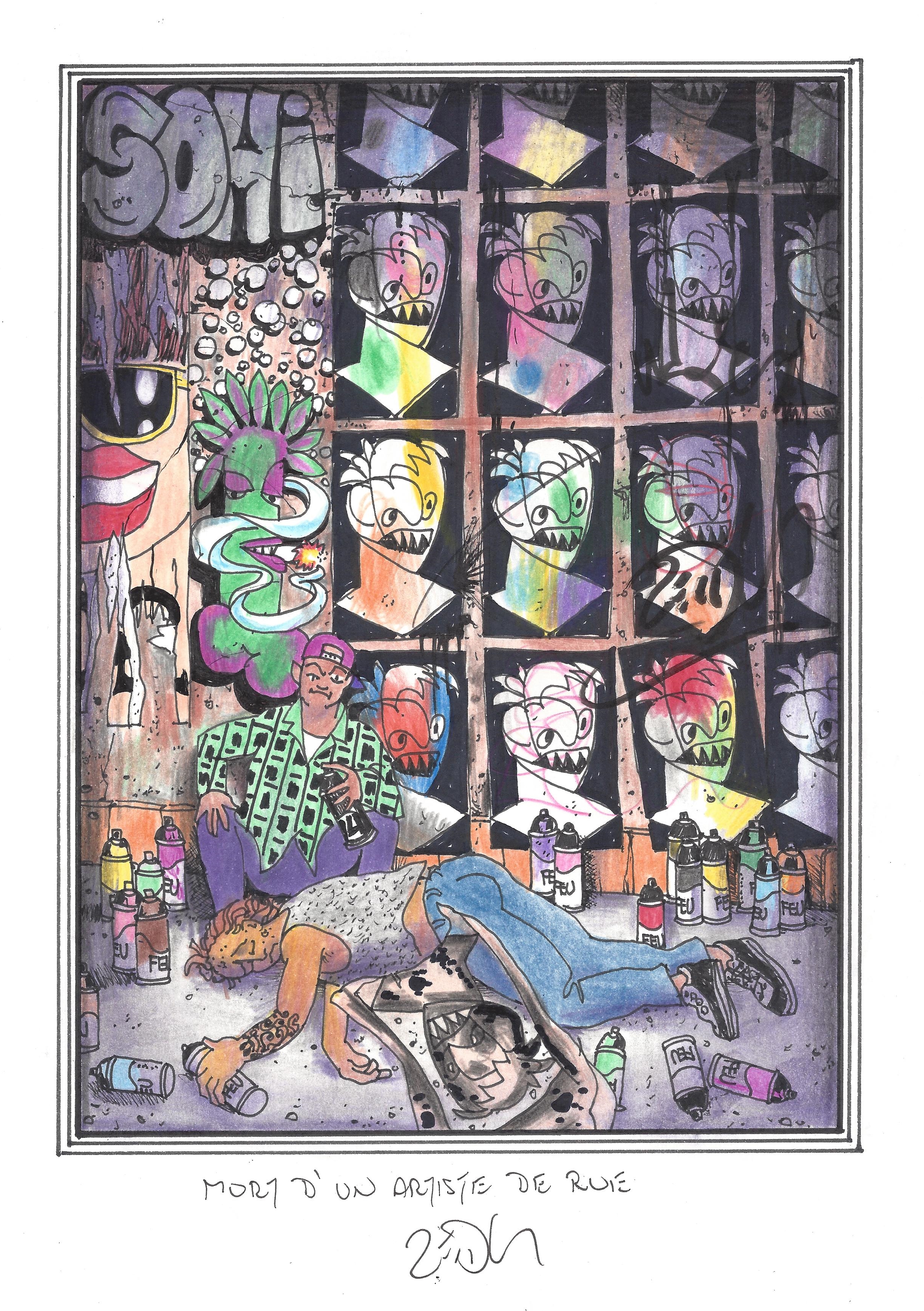 Drawing of the Day – 2977 – Dessin du jour « Death of a street artist – Mort d’un artiste de rue » Ink & colour on Paper – 8 x 12″ (21 x 30 cm) – Encre & couleurs sur Papier