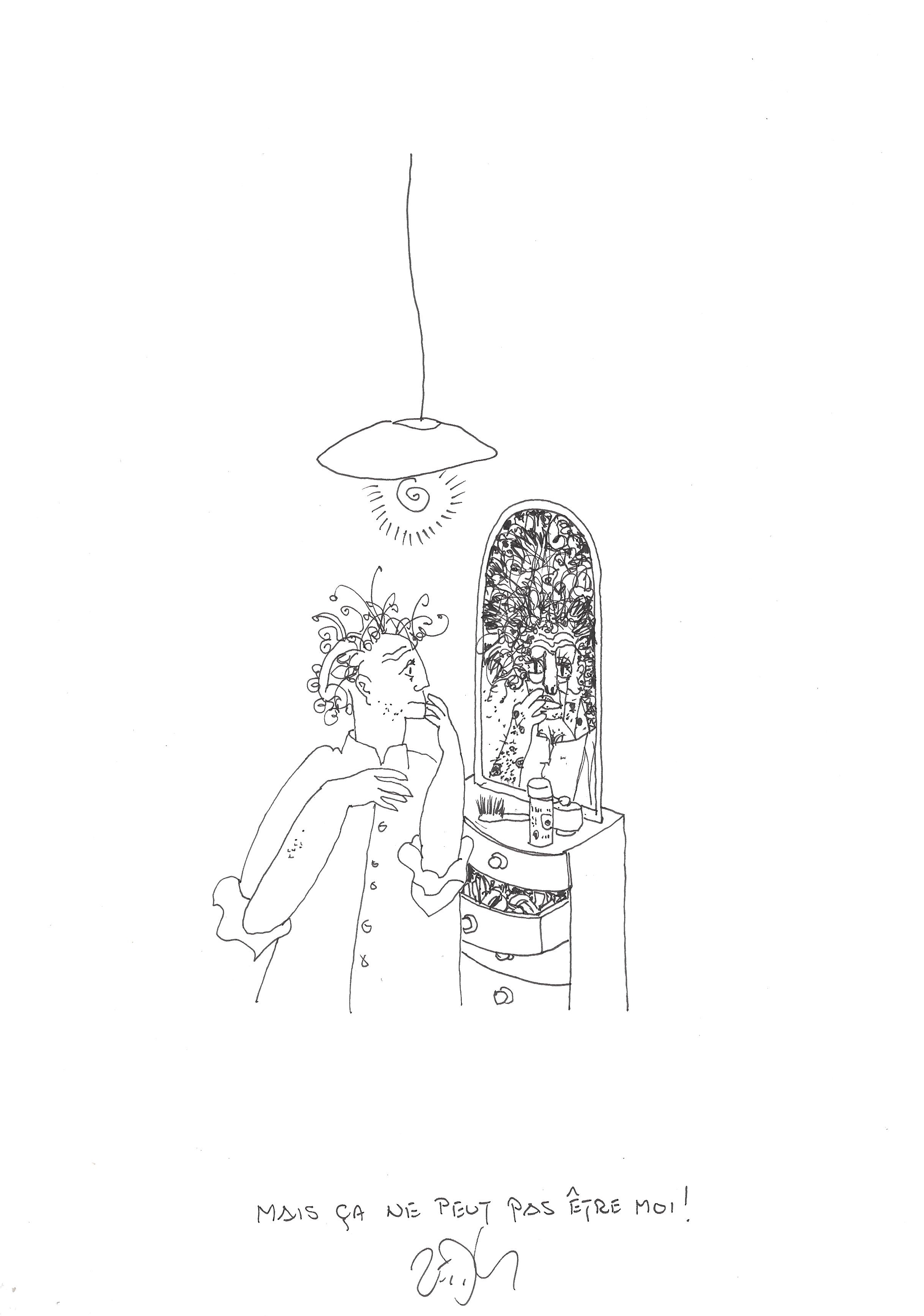 Drawing of the Day – 2831 – Dessin du jour « This can’t be me ! – Mais ça ne peut pas être moi ! » Ink on Paper – 8 x 12″ (21 x 30 cm) – Encre sur Papier