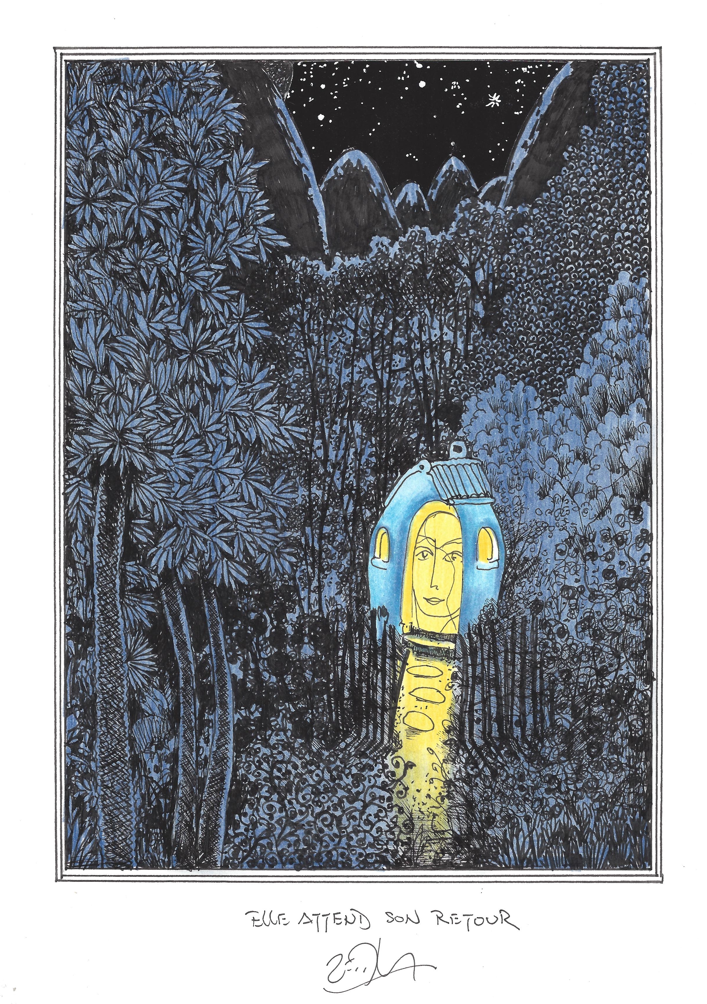 Drawing of the Day – 2832 – Dessin du jour « She waits for his return – Elle attend son retour » Ink & colour on Paper – 8 x 12″ (21 x 30 cm) – Encre & couleurs sur Papier