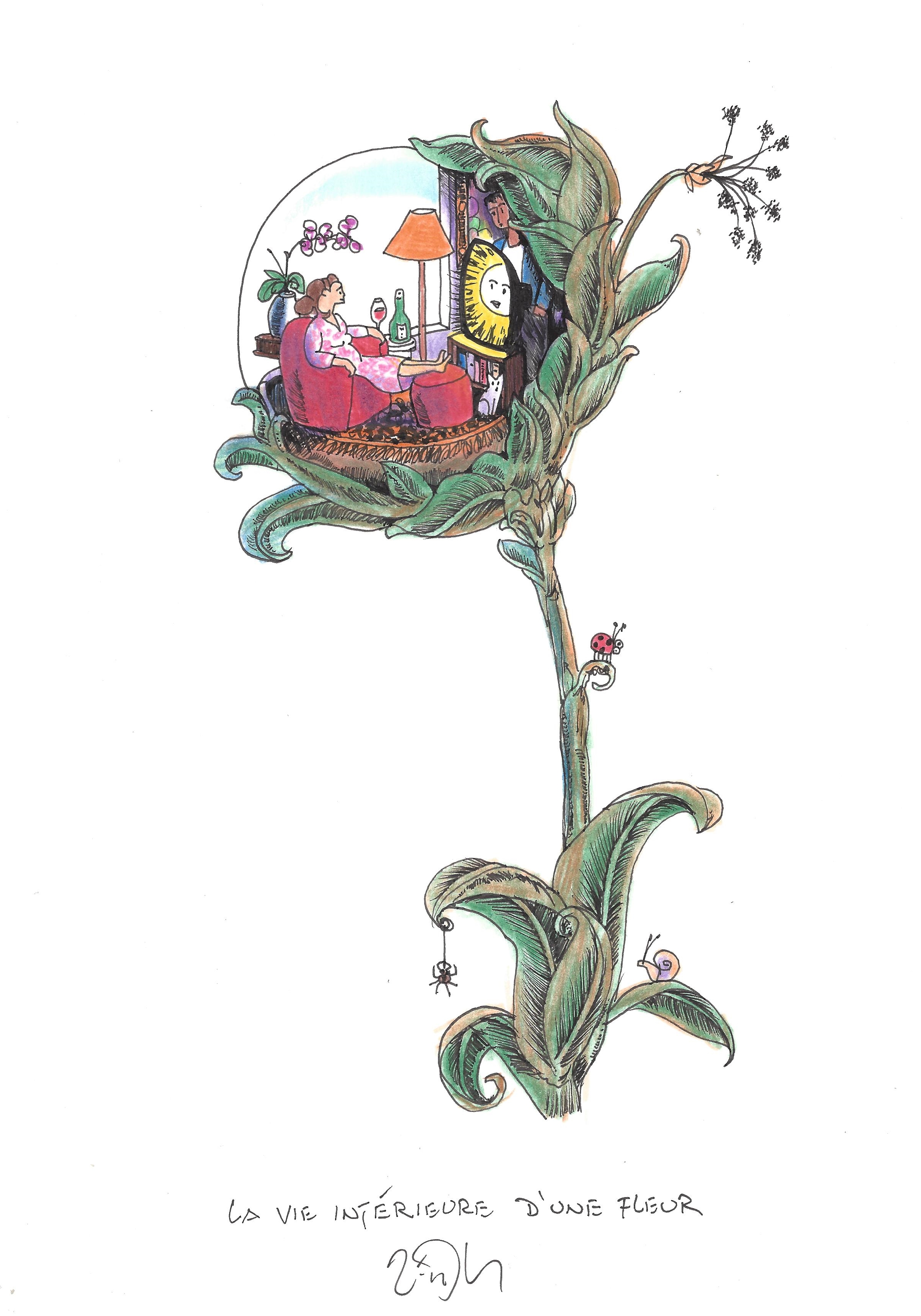 Drawing of the Day – 2836 – Dessin du jour « The inner life of a flower – La vie intérieure d’une fleur » Ink & colour on Paper – 8 x 12″ (21 x 30 cm) – Encre & couleurs sur Papier