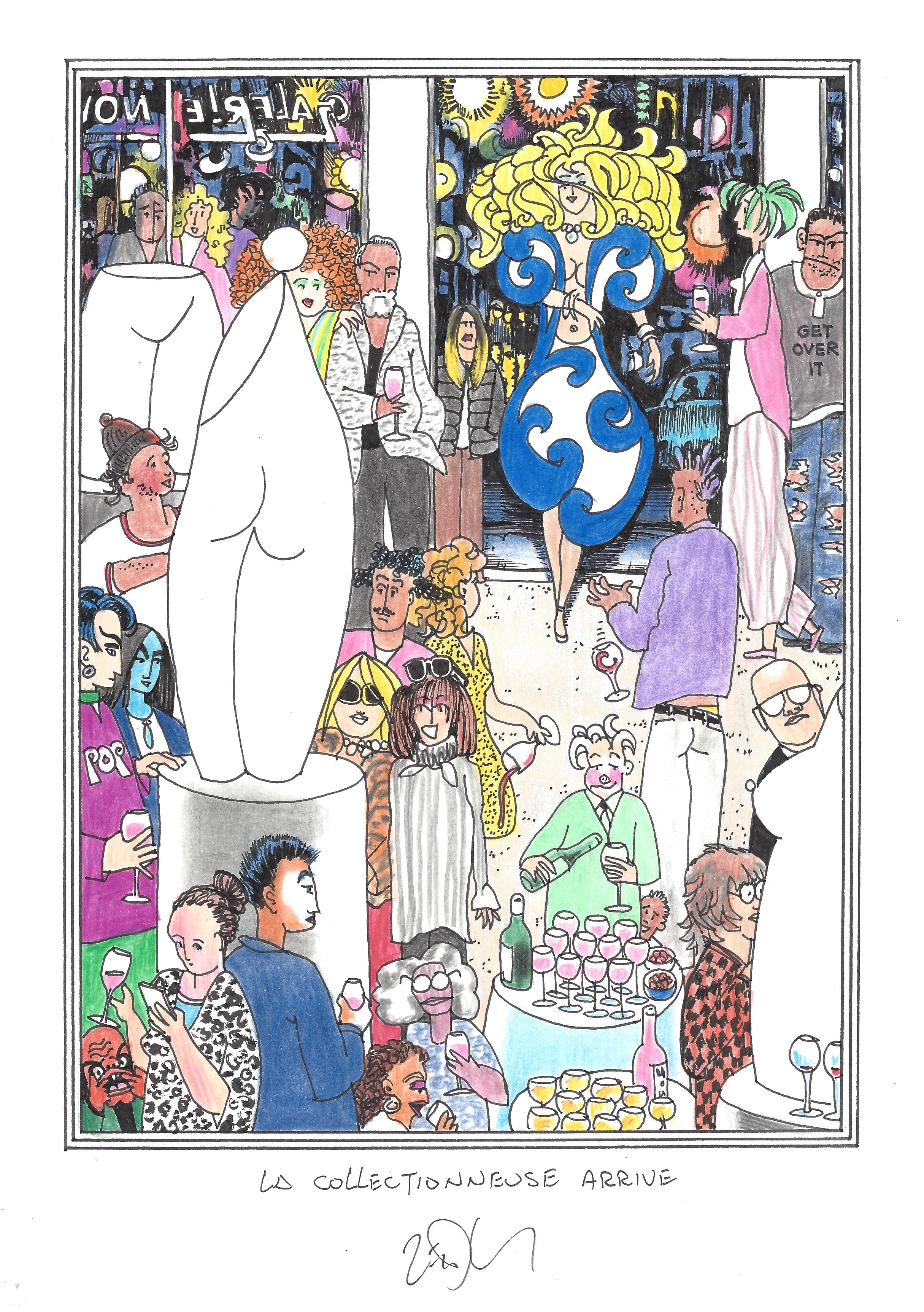Drawing of the Day – 2837 – Dessin du jour « The collector arrives – La collectionneuse arrive » Ink & colour on Paper – 8 x 12″ (21 x 30 cm) – Encre & couleurs sur Papier