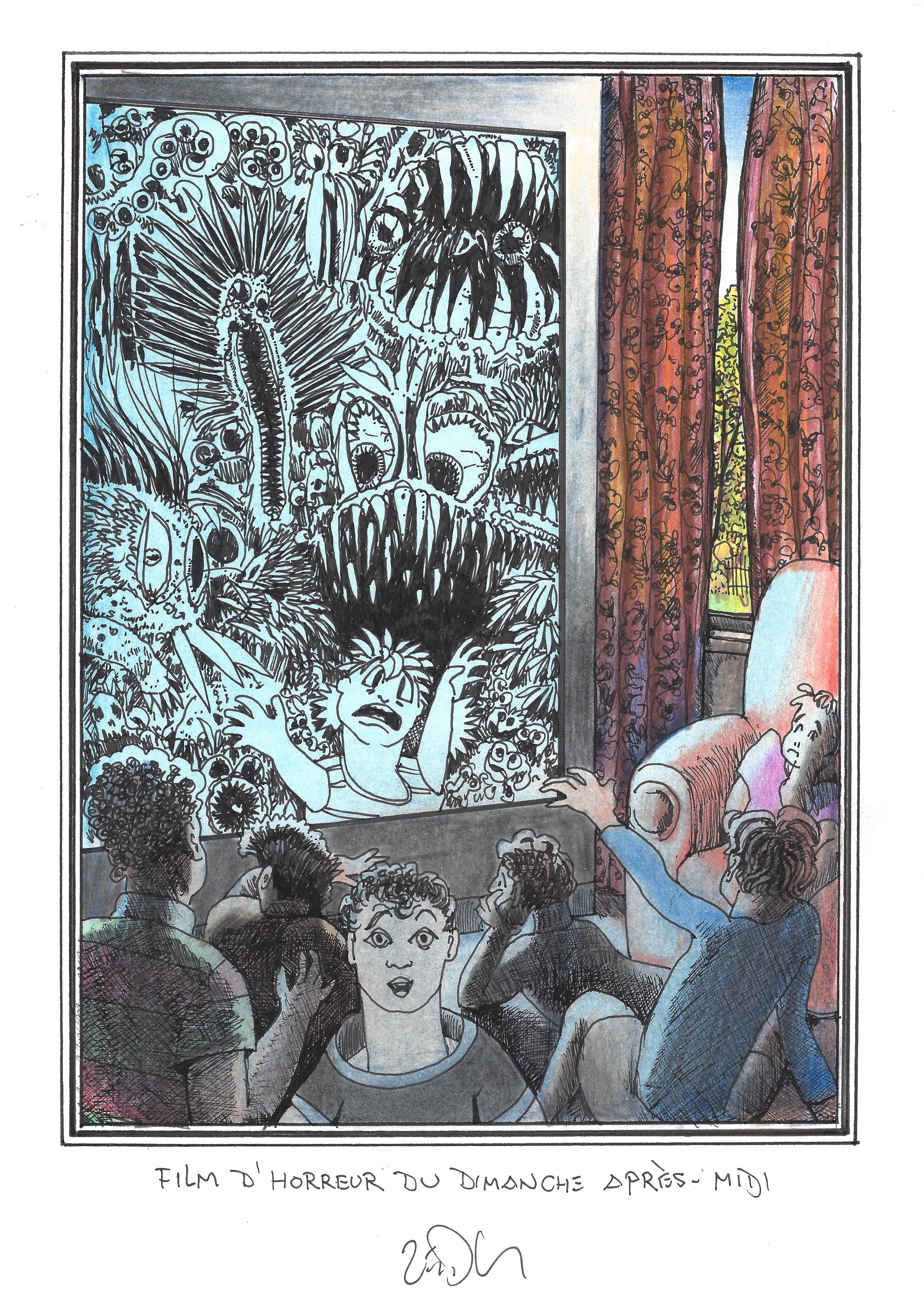 Drawing of the Day – 2818 – Dessin du jour « Sunday afternoon horror movie – Film d’horreur du dimanche après-midi » Ink & colour on Paper – 8 x 12″ (21 x 30 cm) – Encre & couleurs sur Papier
