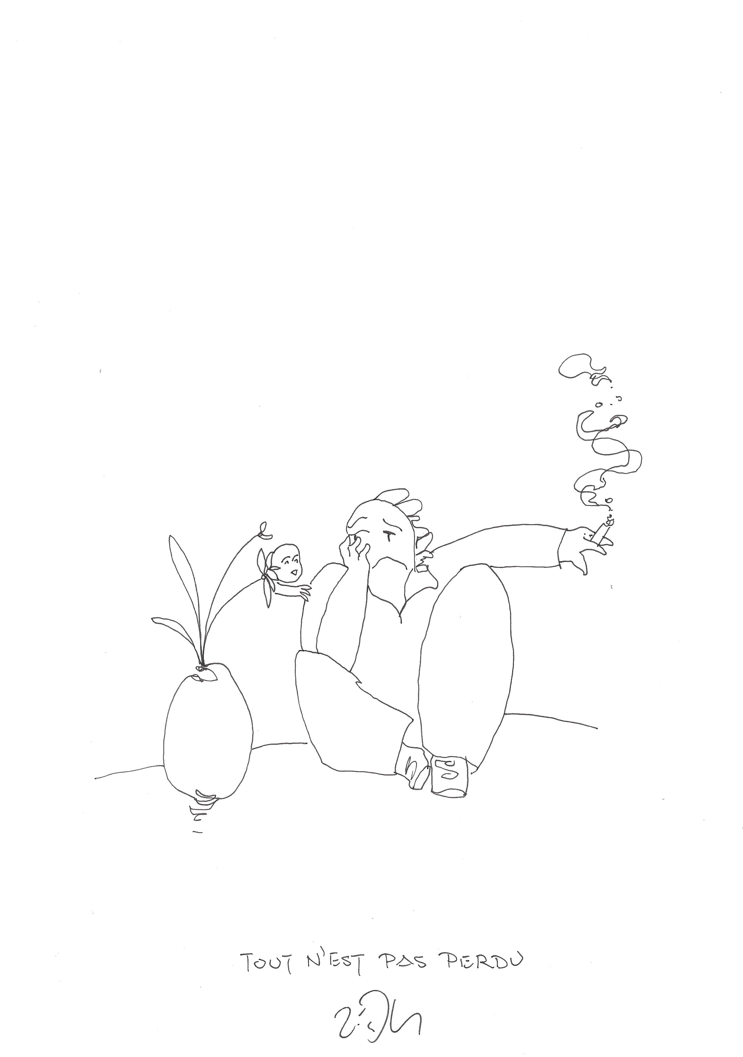 Drawing of the Day – 2819 – Dessin du jour « Not all is lost – Tout n’est pas perdu » Ink on Paper – 8 x 12″ (21 x 30 cm) – Encre sur Papier