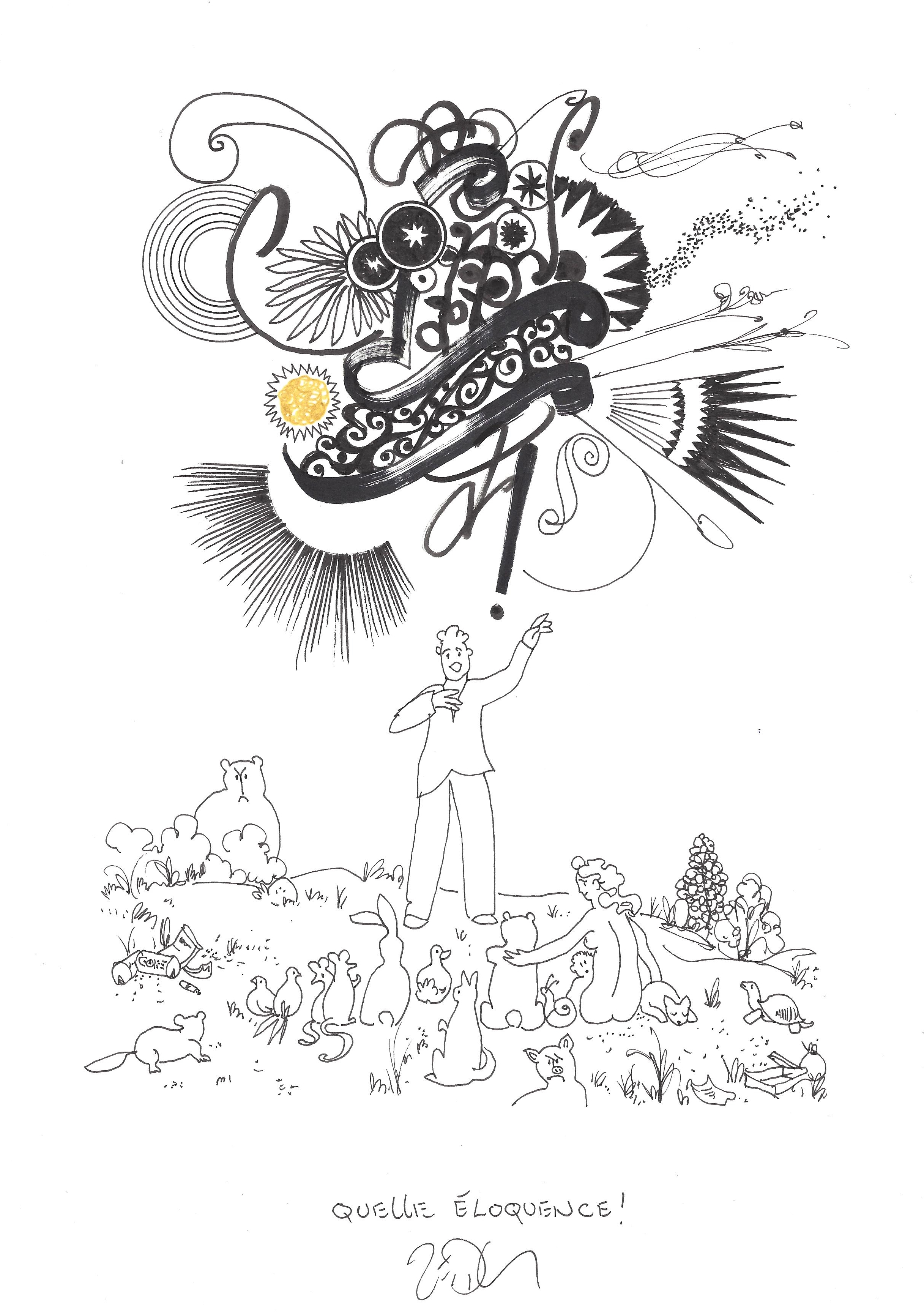Drawing of the Day – 2820 – Dessin du jour « How beautifully he expresses himself ! – Quelle éloquence ! » Ink on Paper – 8 x 12″ (21 x 30 cm) – Encre sur Papier