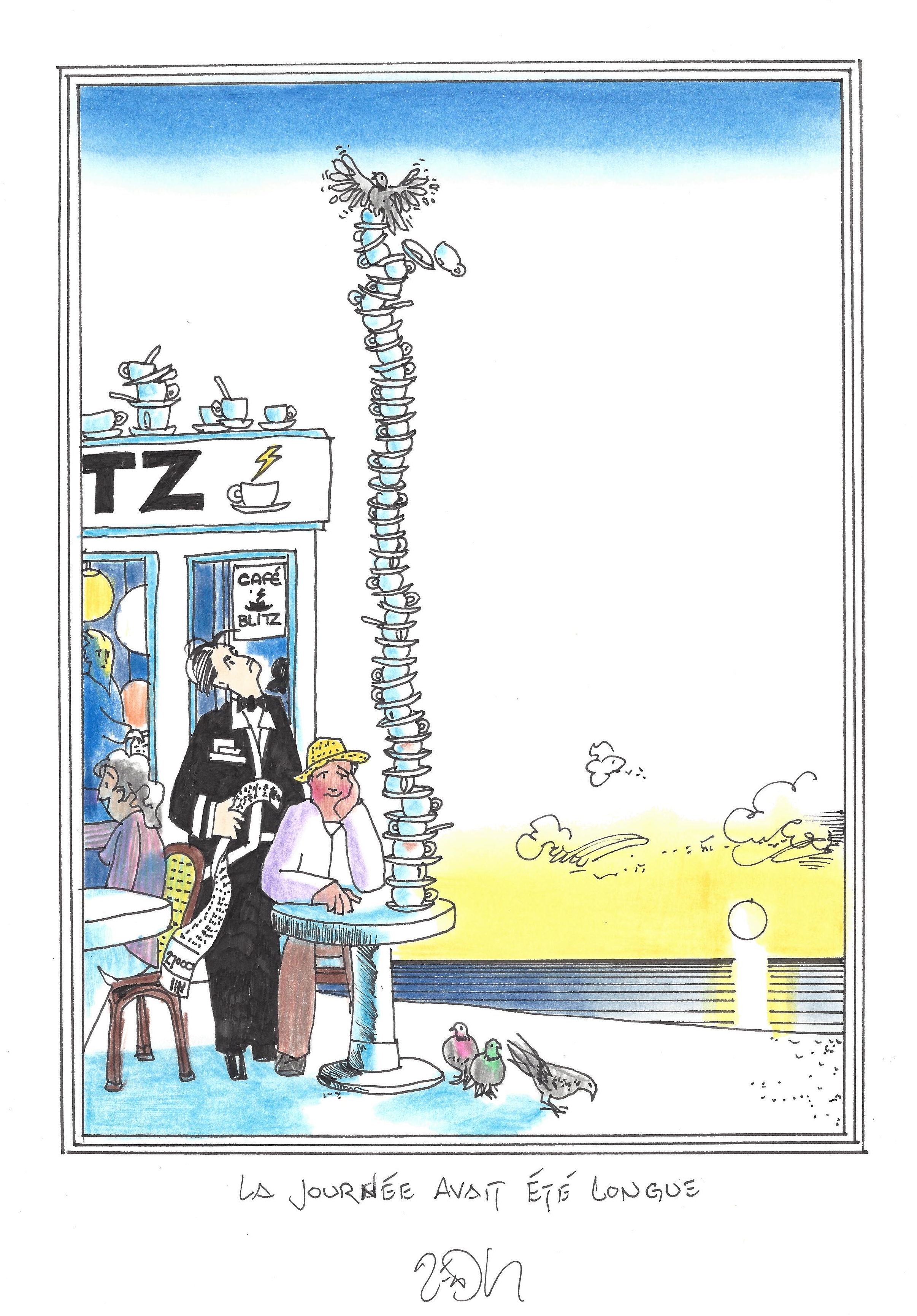Drawing of the Day – 2822 – Dessin du jour « It had been a long day – La journée avait été longue » Ink & colour on Paper – 8 x 12″ (21 x 30 cm) – Encre & couleurs sur Papier