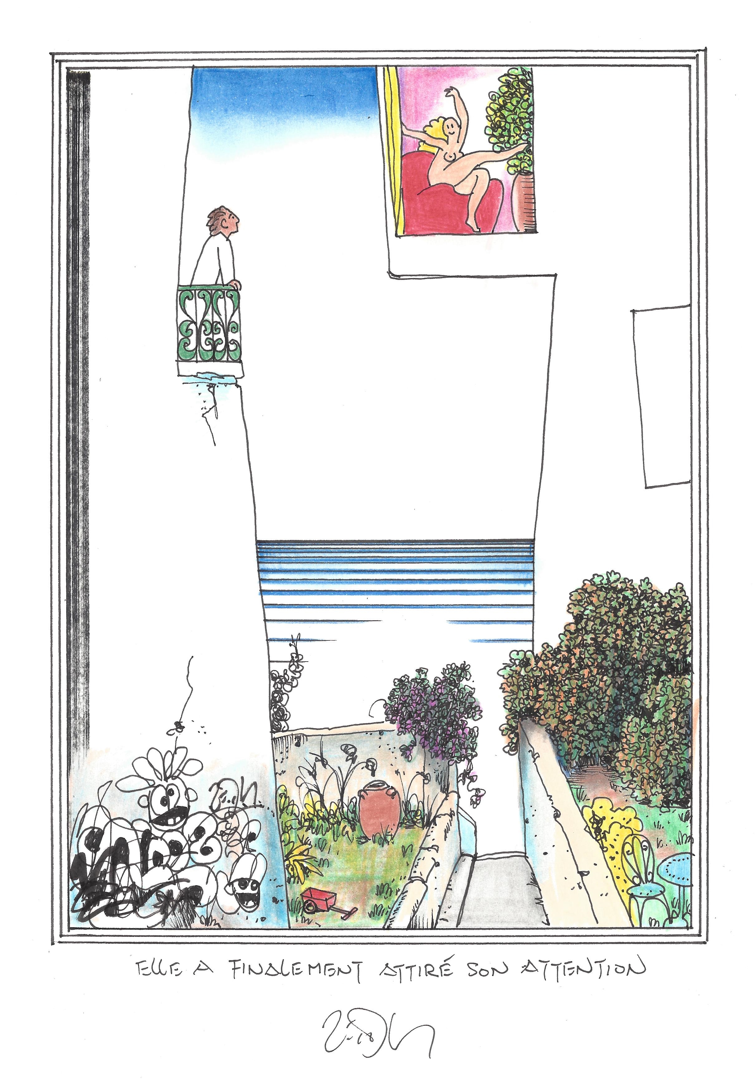 Drawing of the Day – 2827 – Dessin du jour « She finally got his attention – Elle a finalement attiré son attention » Ink & colour on Paper – 8 x 12″ (21 x 30 cm) – Encre & couleurs sur Papier