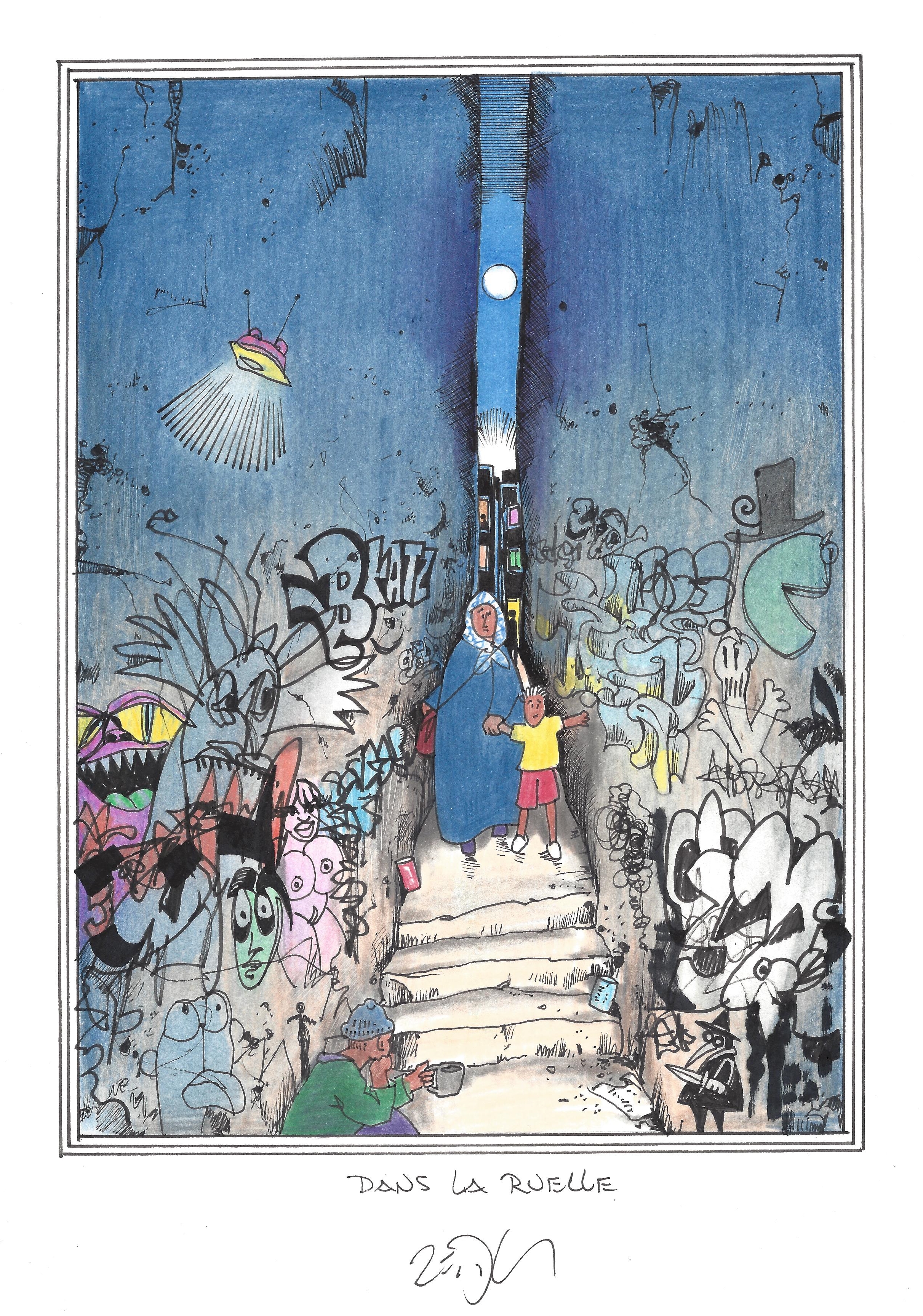 Drawing of the Day – 2779 – Dessin du jour « Through the alley – Dans la ruelle » Ink & colour on Paper – 8 x 12″ (21 x 30 cm) – Encre & couleurs sur Papier