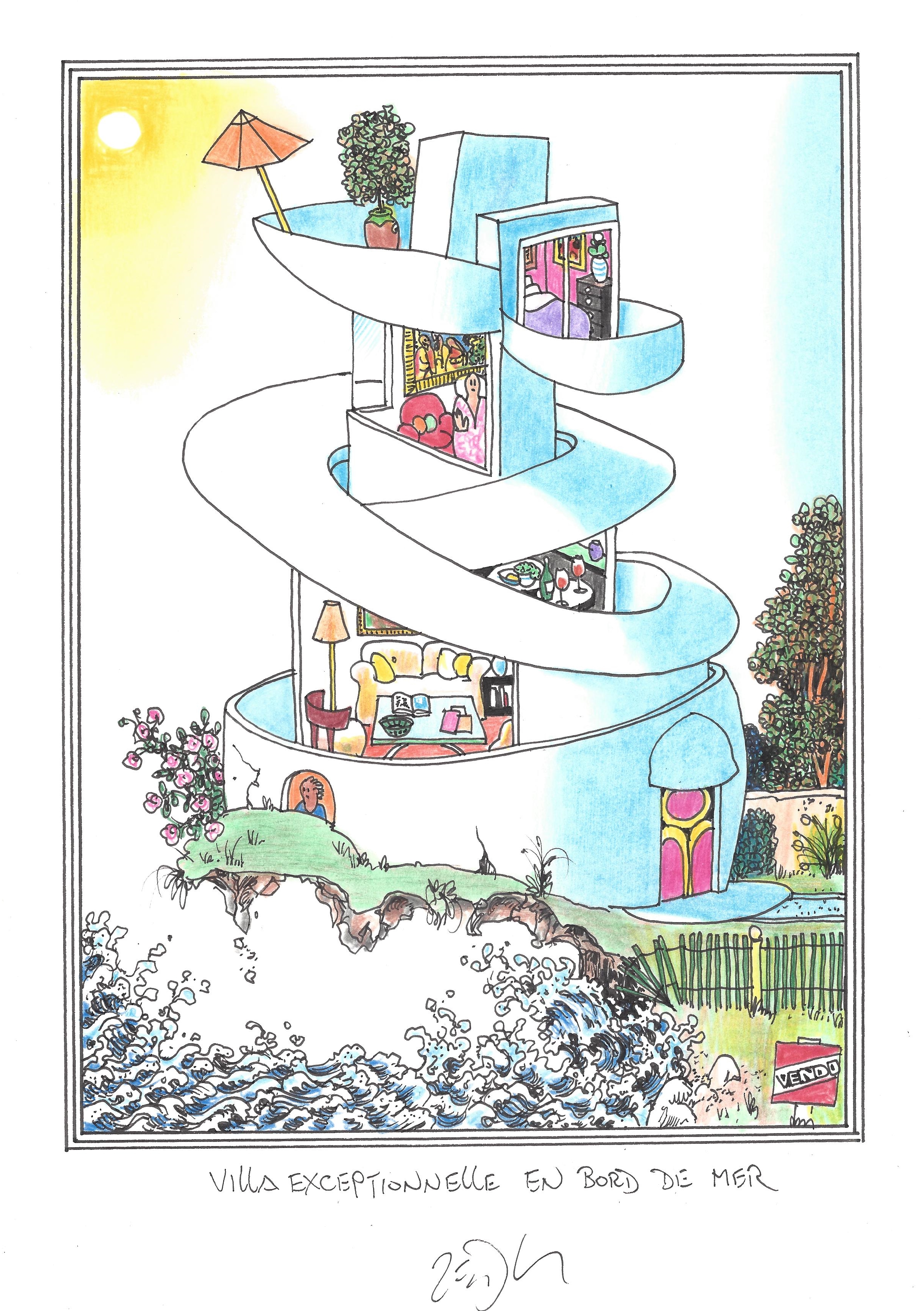 Drawing of the Day – 2783 – Dessin du jour « Luxury real estate, exclusive waterfront – Villa exceptionnelle en bord de mer » Ink & colour on Paper – 8 x 12″ (21 x 30 cm) – Encre & couleurs sur Papier