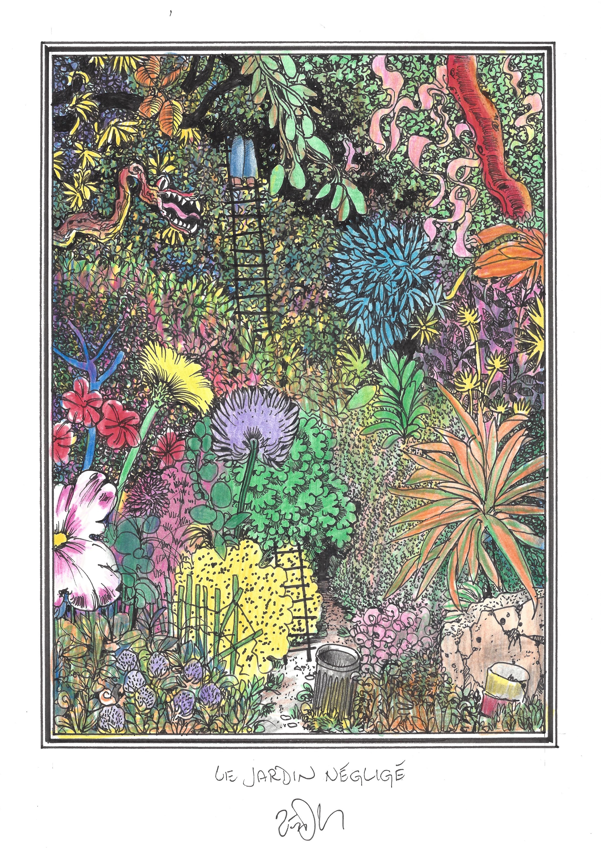 Drawing of the Day – 2784 – Dessin du jour « The overgrown garden – Le jardin négligé » Ink & colour on Paper – 8 x 12″ (21 x 30 cm) – Encre & couleurs sur Papier