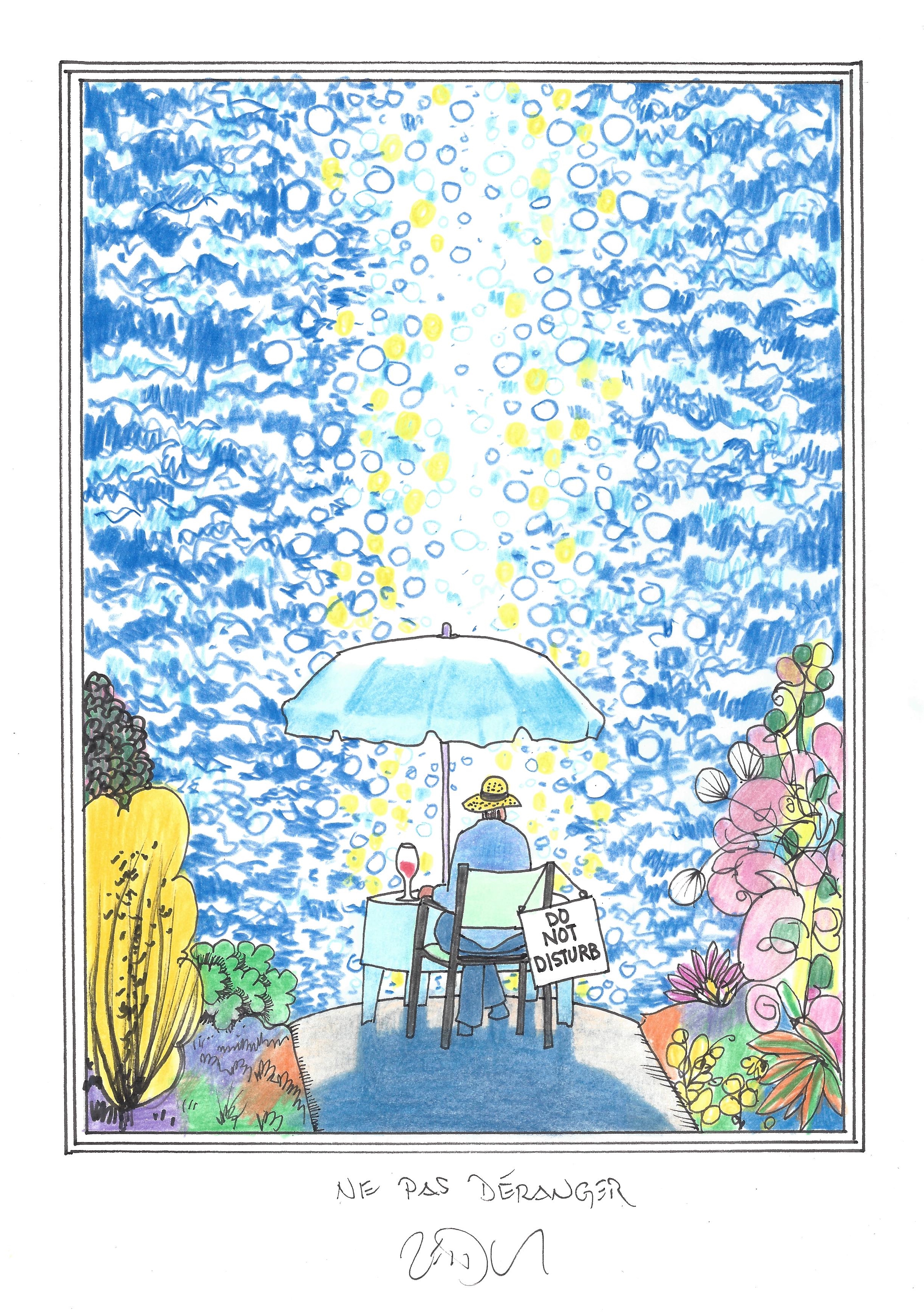 Drawing of the Day – 2786 – Dessin du jour « Do not disturb – Ne pas déranger » Ink & colour on Paper – 8 x 12″ (21 x 30 cm) – Encre & couleurs sur Papier
