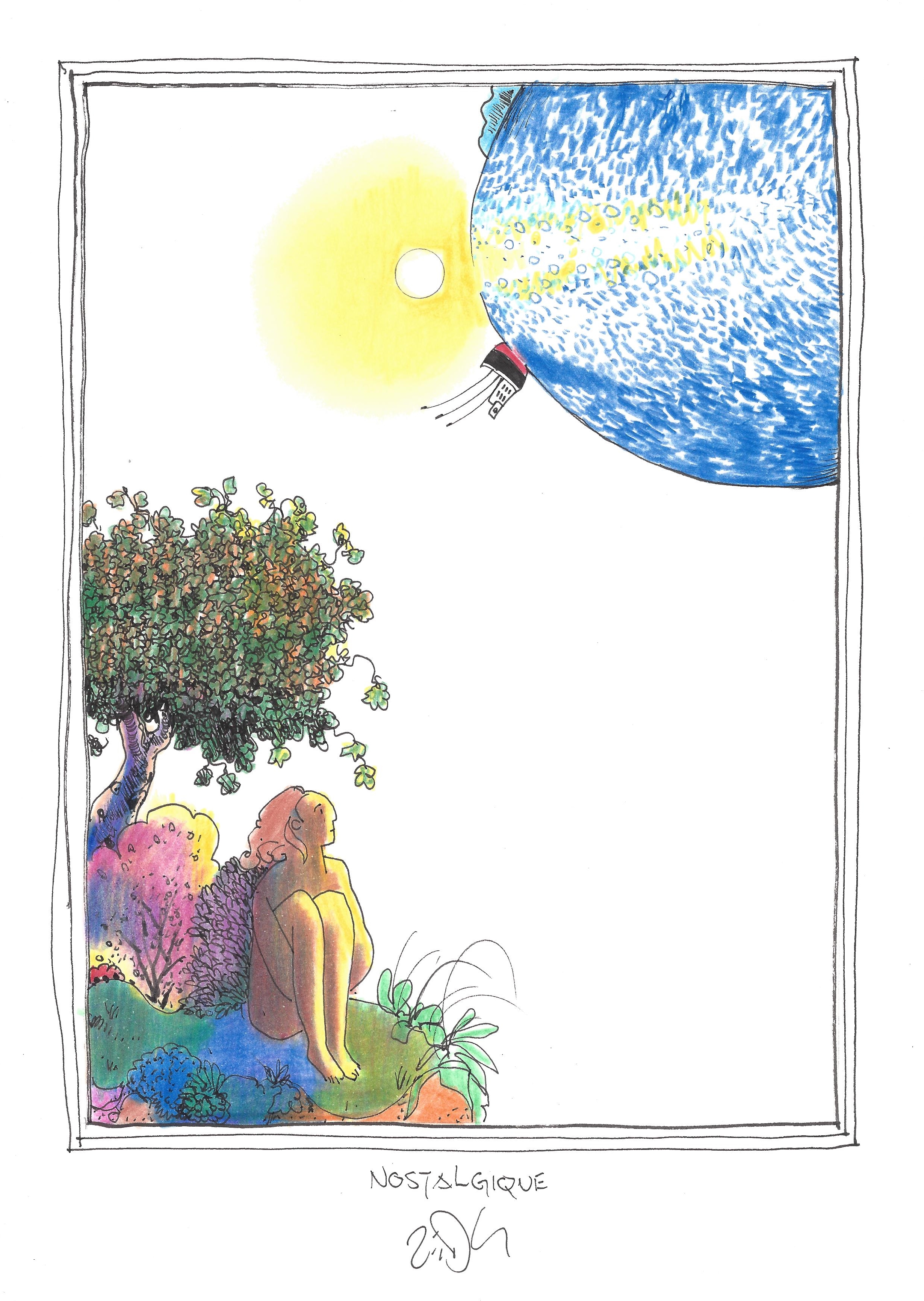 Drawing of the Day – 2788 – Dessin du jour « Wistful – Nostalgique » Ink & colour on Paper – 8 x 12″ (21 x 30 cm) – Encre & couleurs sur Papier