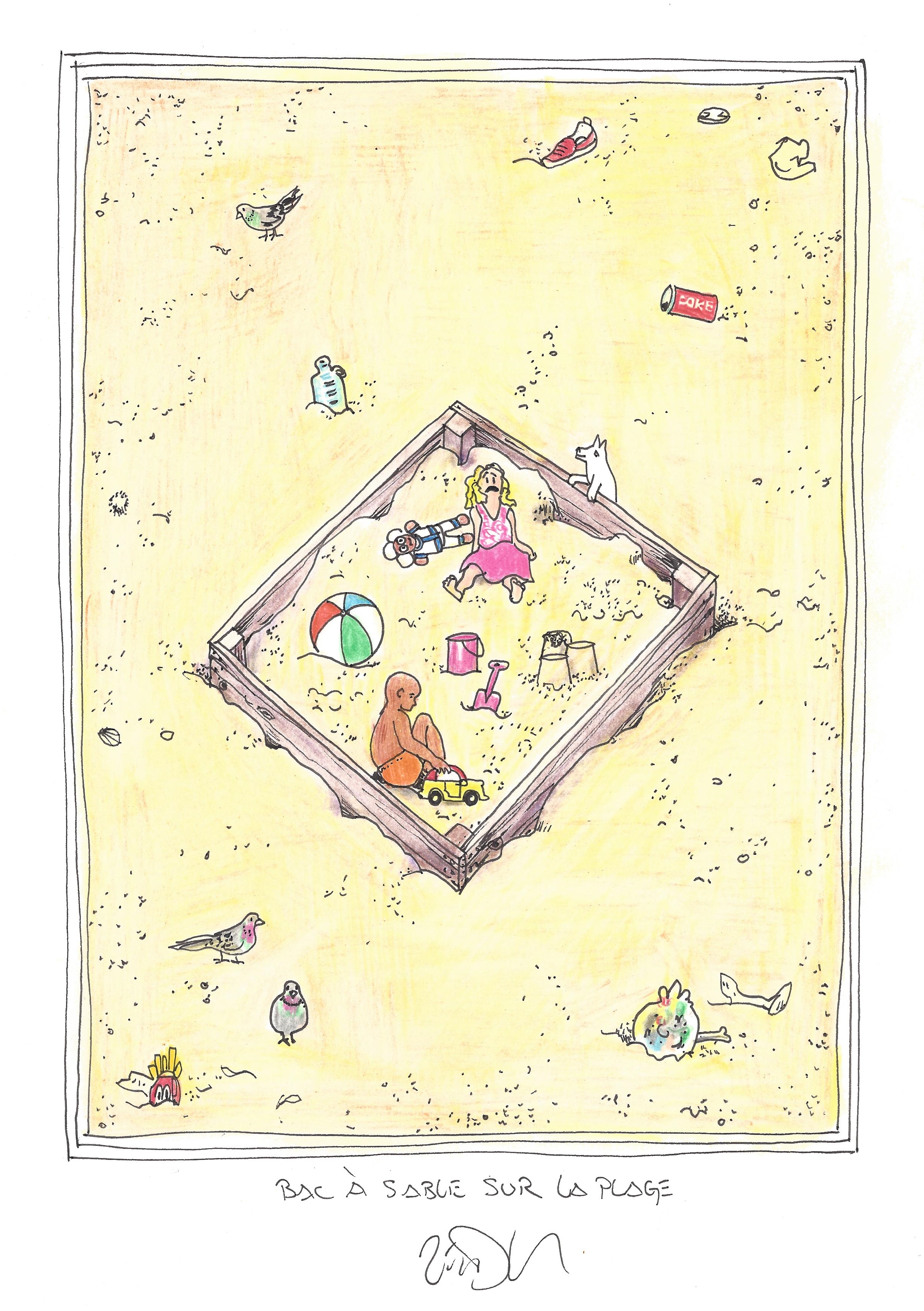Drawing of the Day – 2759 – Dessin du jour « Sandbox on the beach – Bac à sable sur la plage » Ink & colour on Paper – 8 x 12″ (21 x 30 cm) – Encre & couleurs sur Papier