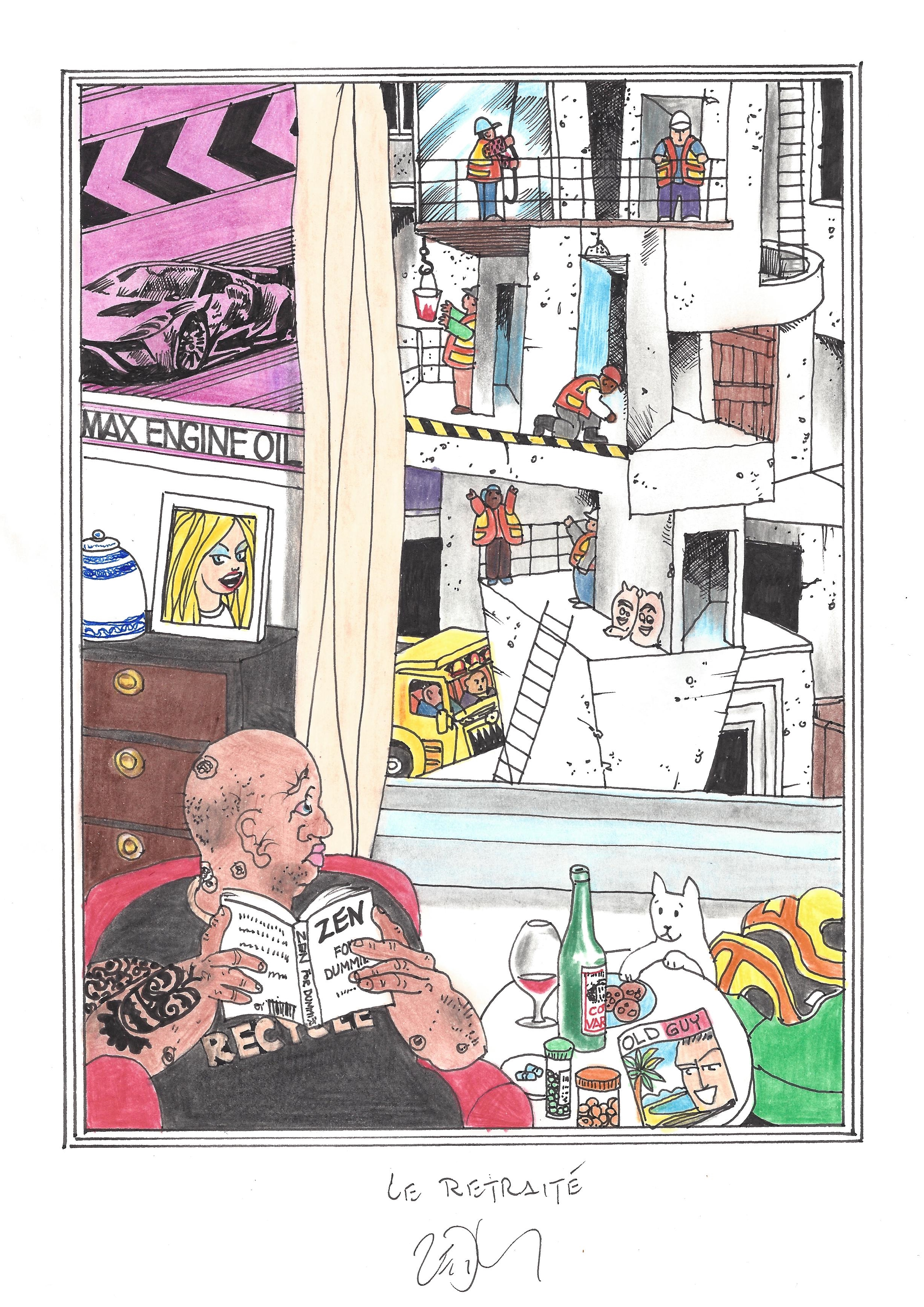 Drawing of the Day – 2762 – Dessin du jour « Retired – Le retraité » Ink & colour on Paper – 8 x 12″ (21 x 30 cm) – Encre & couleurs sur Papier