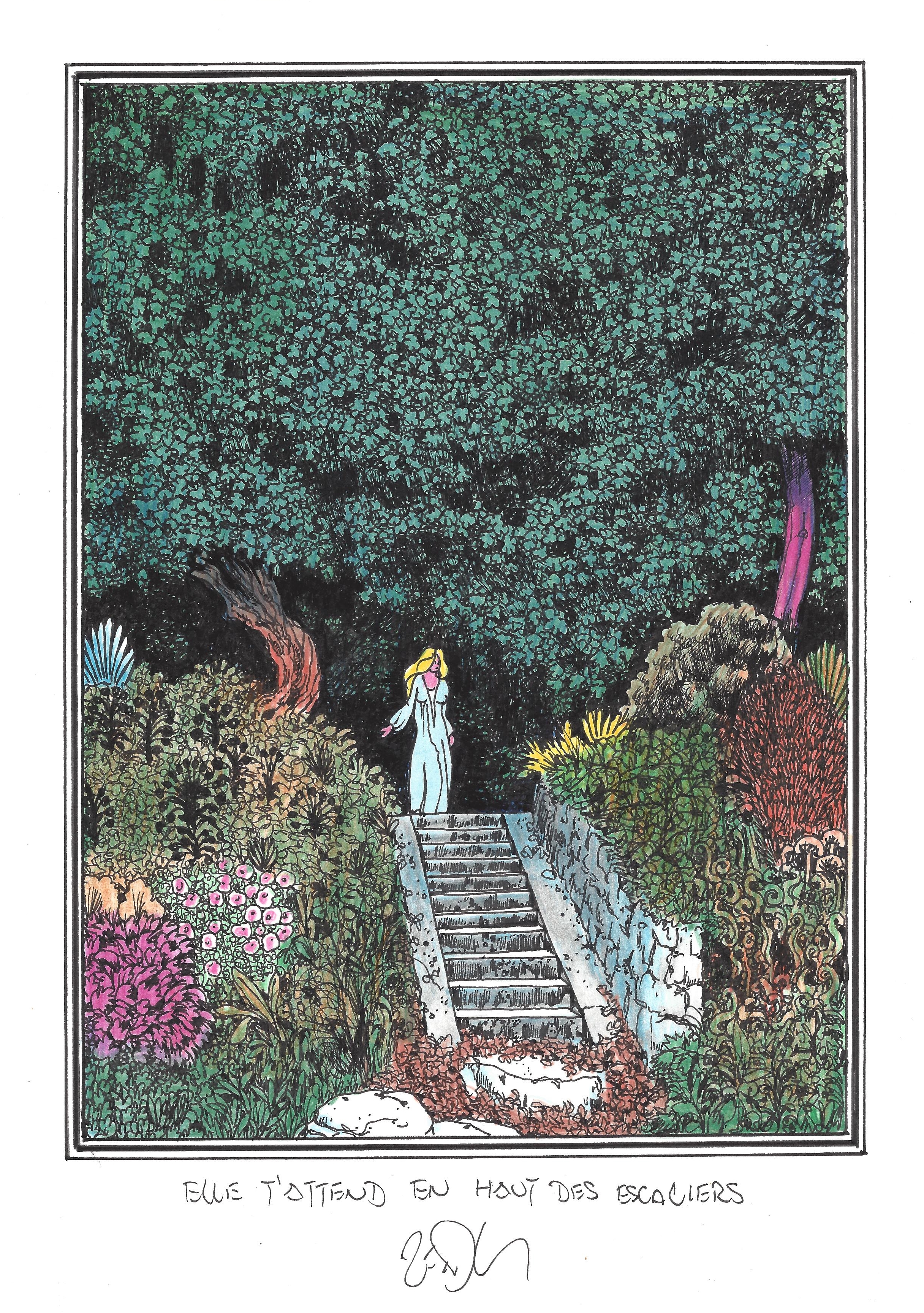 Drawing of the Day – 2763 – Dessin du jour « She waits for you at the top of the stairs – Elle t’attend en haut des escaliers » Ink & colour on Paper – 8 x 12″ (21 x 30 cm) – Encre & couleurs sur Papier