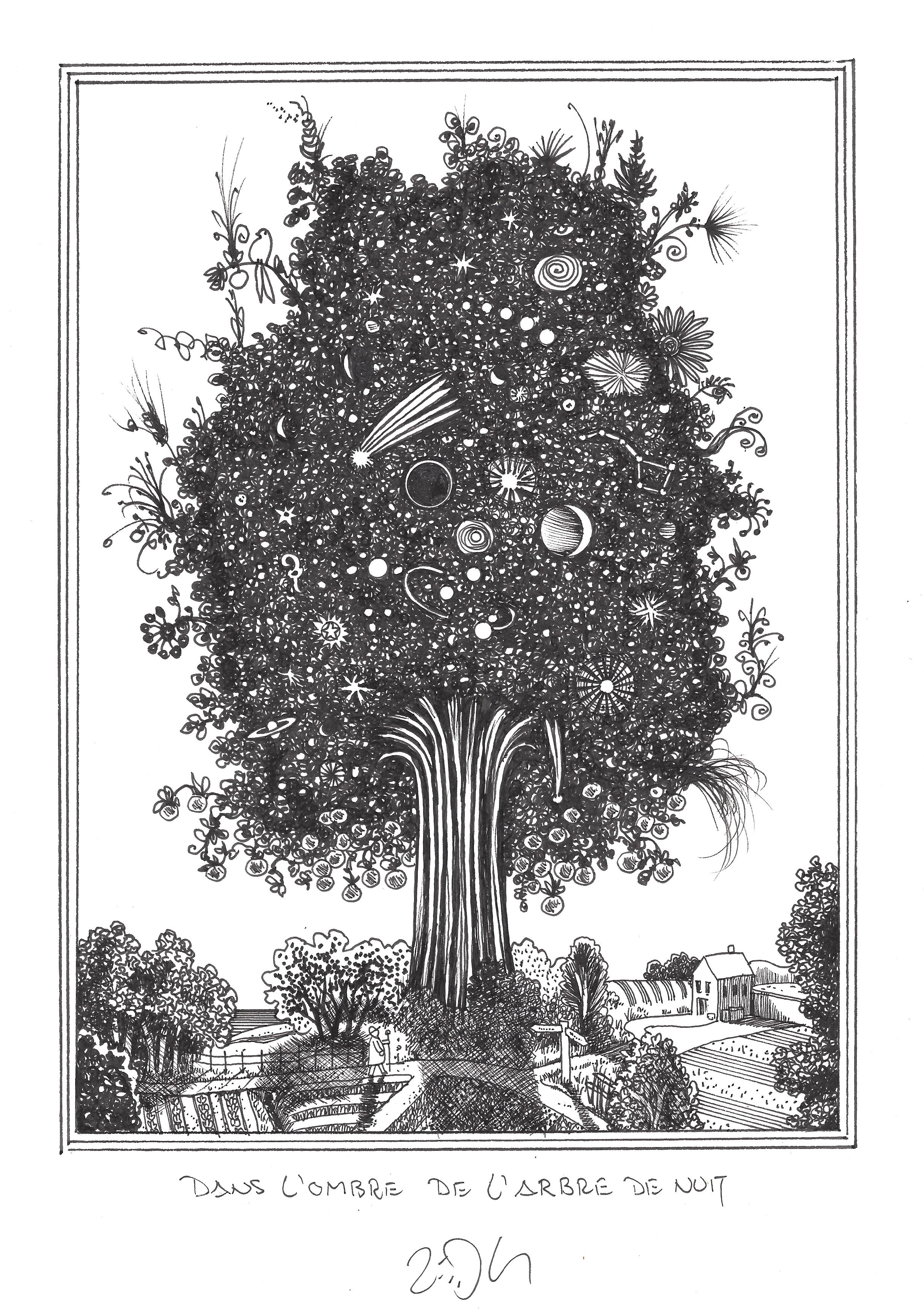 Drawing of the Day – 2764 – Dessin du jour « In the shade of the night tree – Dans l’ombre de l’arbre de nuit » Ink on Paper – 8 x 12″ (21 x 30 cm) – Encre sur Papier