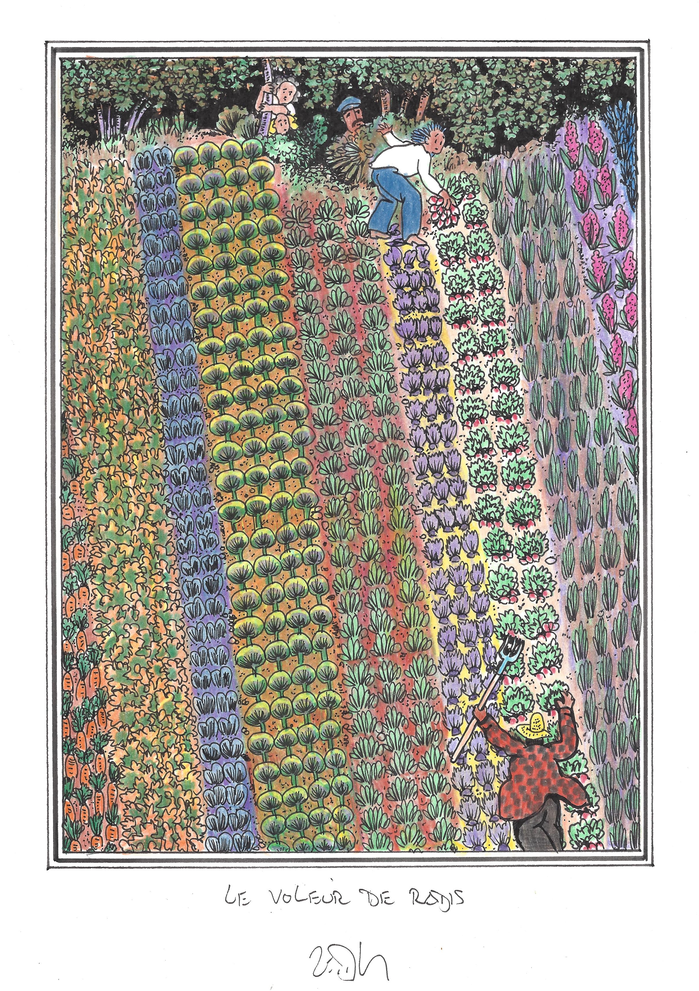 Drawing of the Day – 2767 – Dessin du jour « The radish thief – Le voleur de radis » Ink & colour on Paper – 8 x 12″ (21 x 30 cm) – Encre & couleurs sur Papier