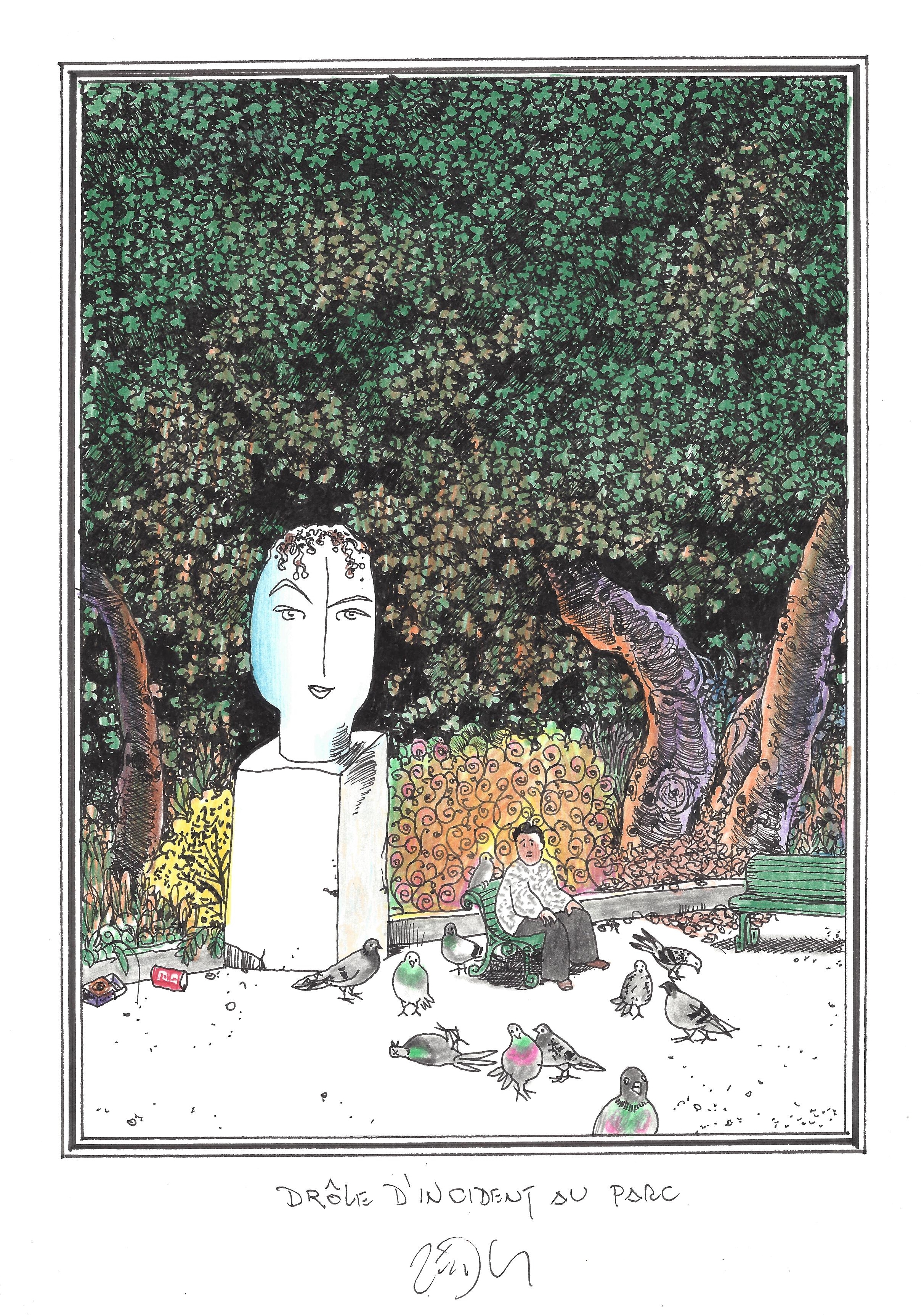 Drawing of the Day – 2768 – Dessin du jour « Curious incident in the park – Drôle d’incident au parc » Ink & colour on Paper – 8 x 12″ (21 x 30 cm) – Encre & couleurs sur Papier