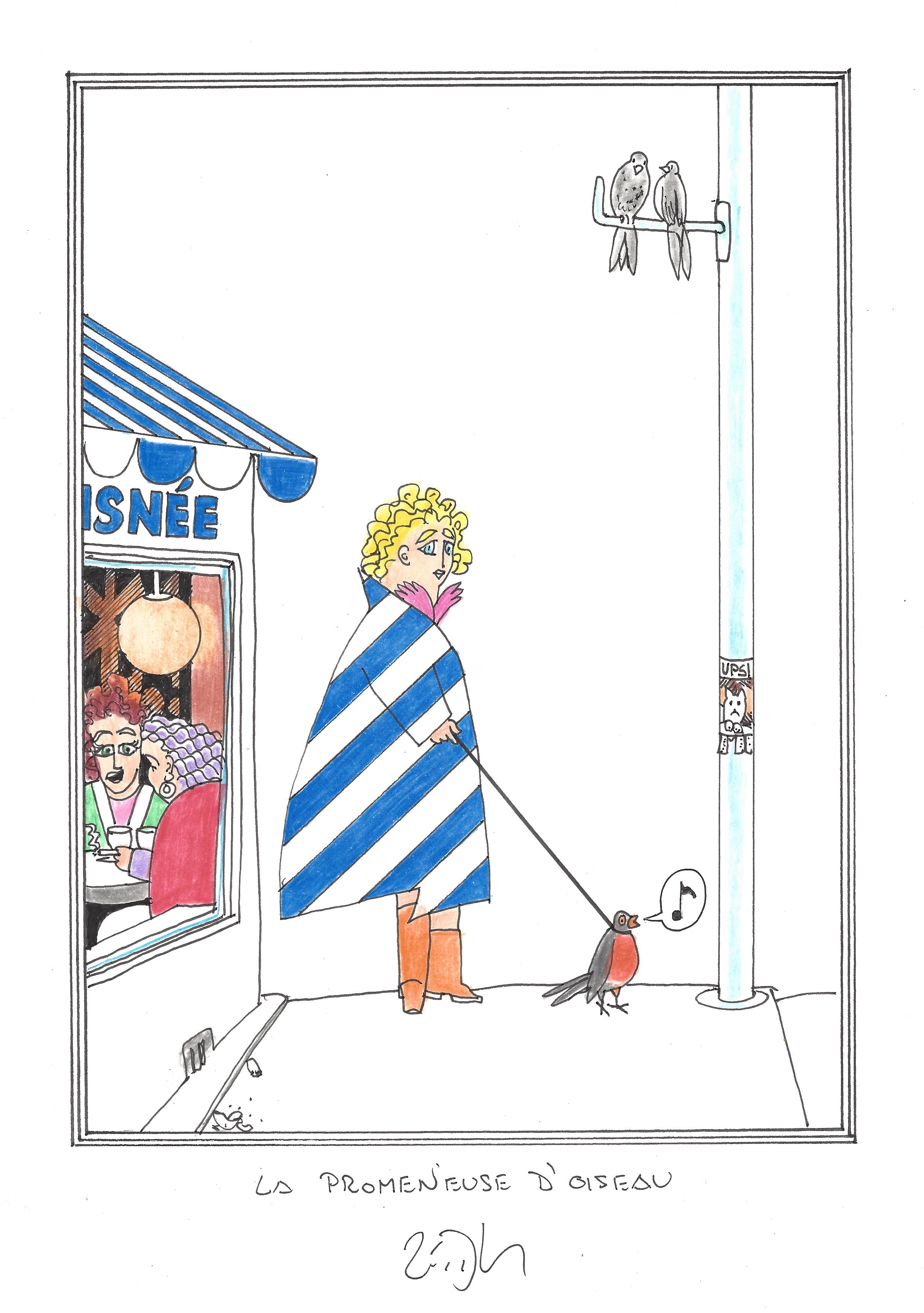 Drawing of the Day – 2761 – Dessin du jour « The bird walker – La promeneuse d’oiseau » Ink & colour on Paper – 8 x 12″ (21 x 30 cm) – Encre & couleurs sur Papier