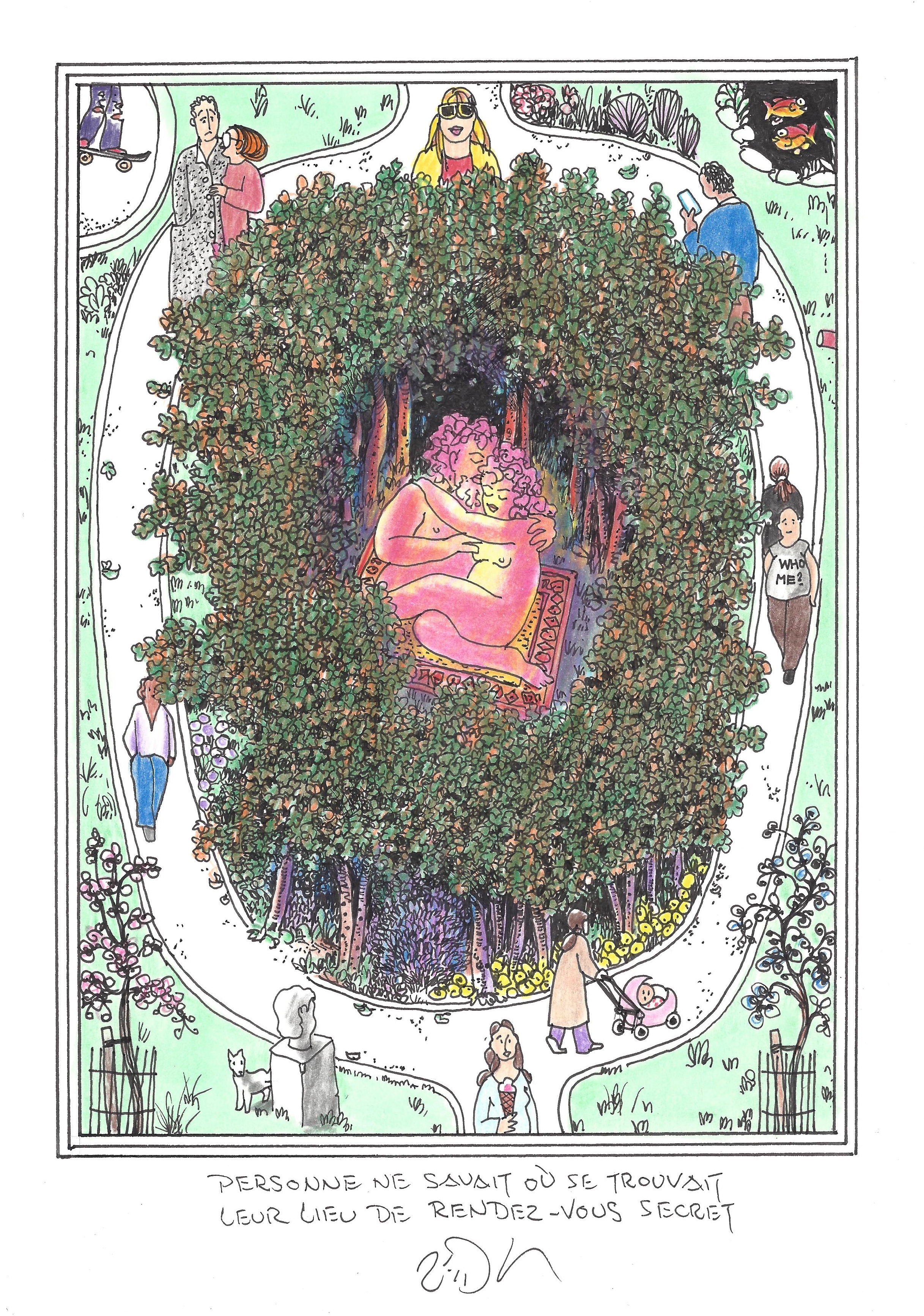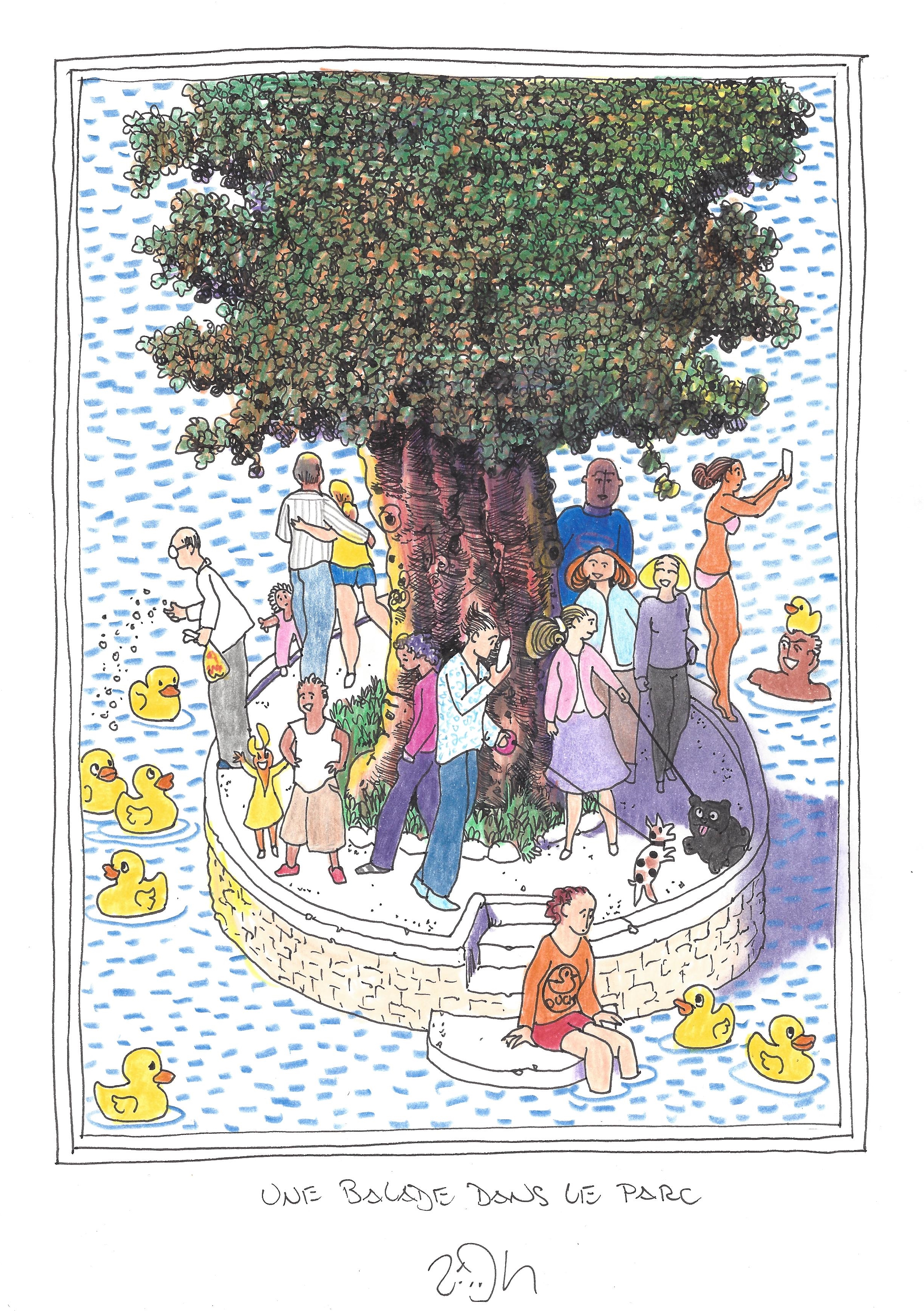 Drawing of the Day – 2751 – Dessin du jour « A walk in the park – Une balade dans le parc » Ink & colour on Paper – 8 x 12″ (21 x 30 cm) – Encre & couleurs sur Papier