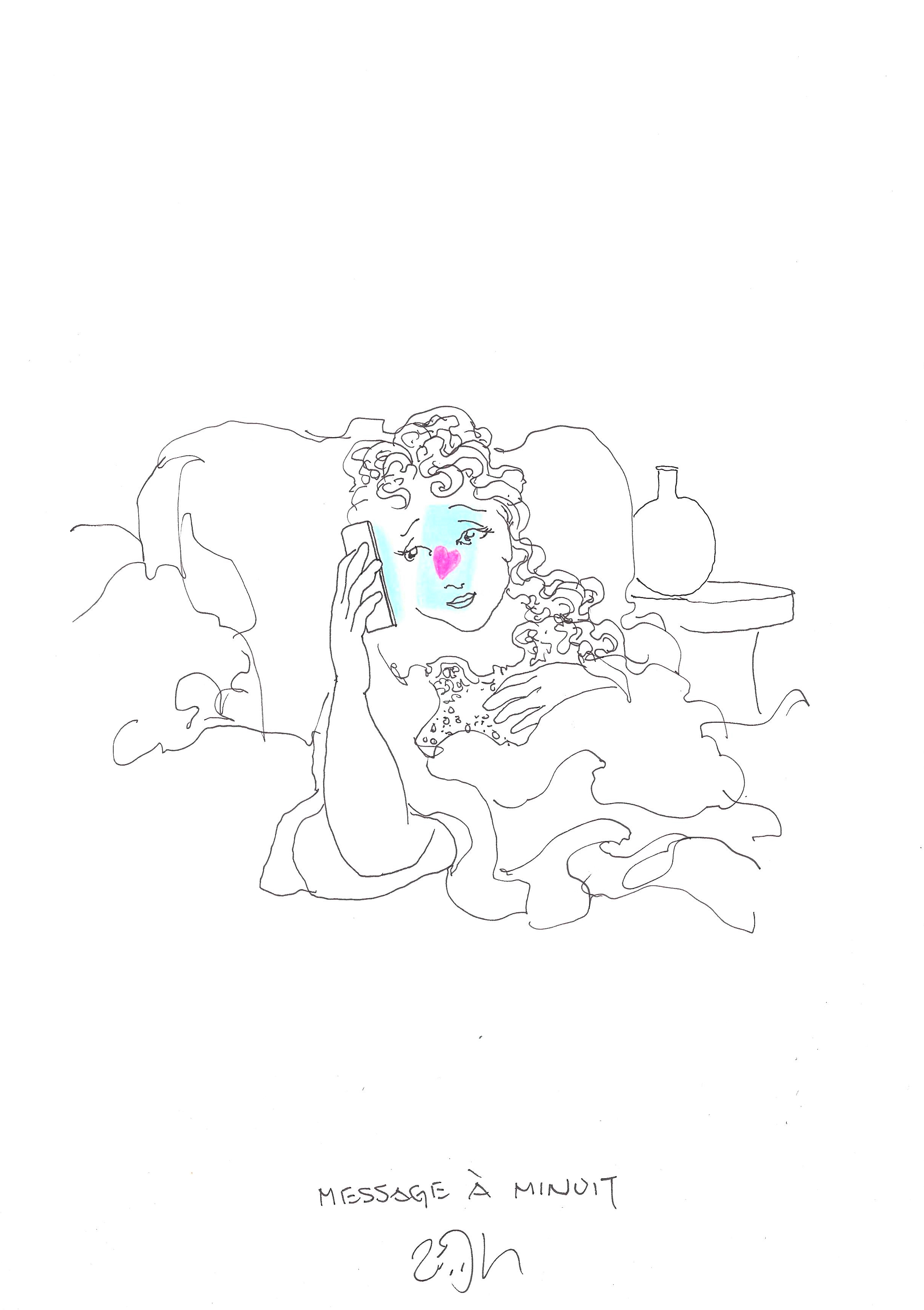 Drawing of the Day – 2752 – Dessin du jour « Midnight message – Message à minuit » Ink & colour on Paper – 8 x 12″ (21 x 30 cm) – Encre & couleurs sur Papier