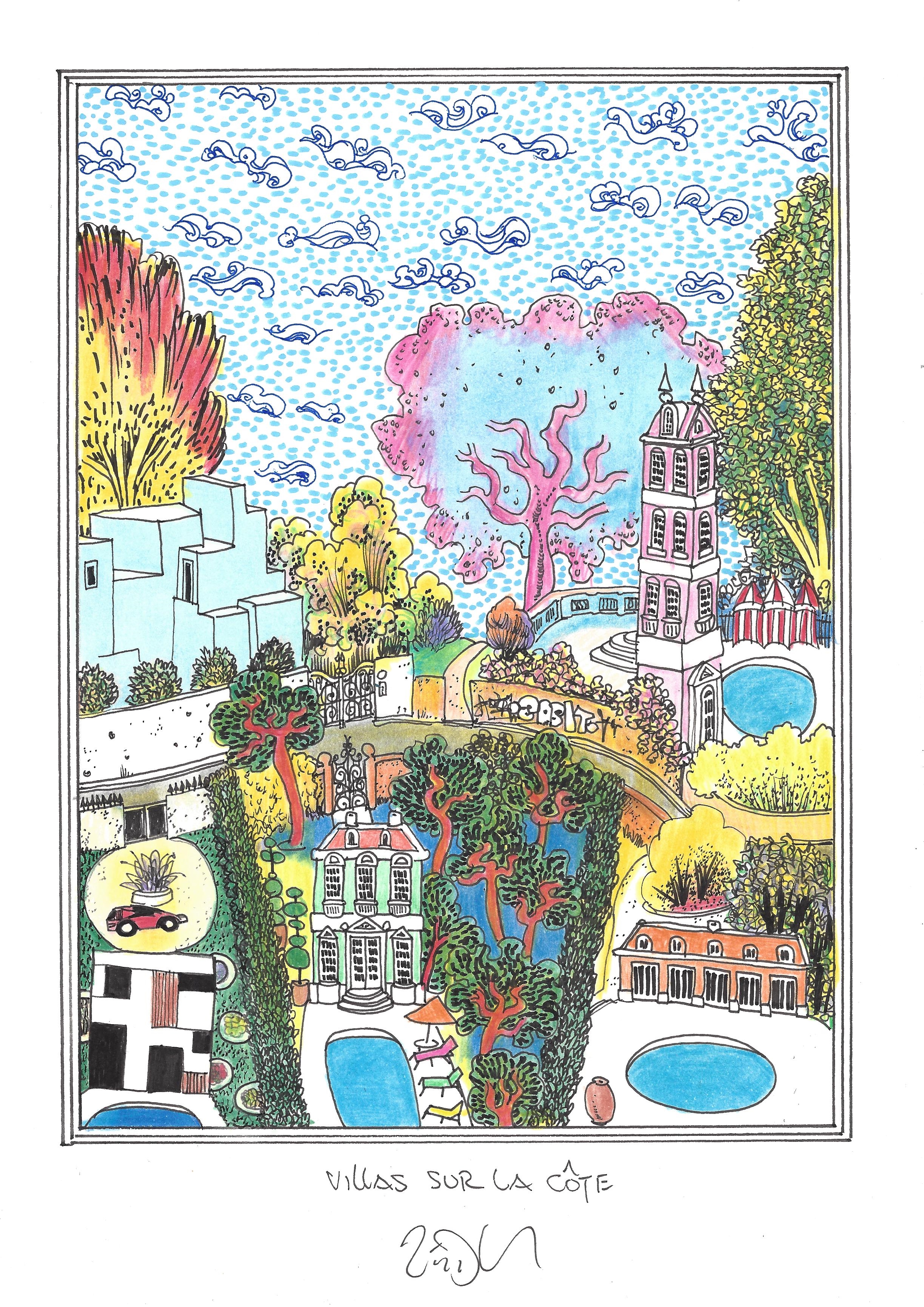 Drawing of the Day – 2753 – Dessin du jour « Villas on the coast – Villas sur la côte » Ink & colour on Paper – 8 x 12″ (21 x 30 cm) – Encre & couleurs sur Papier