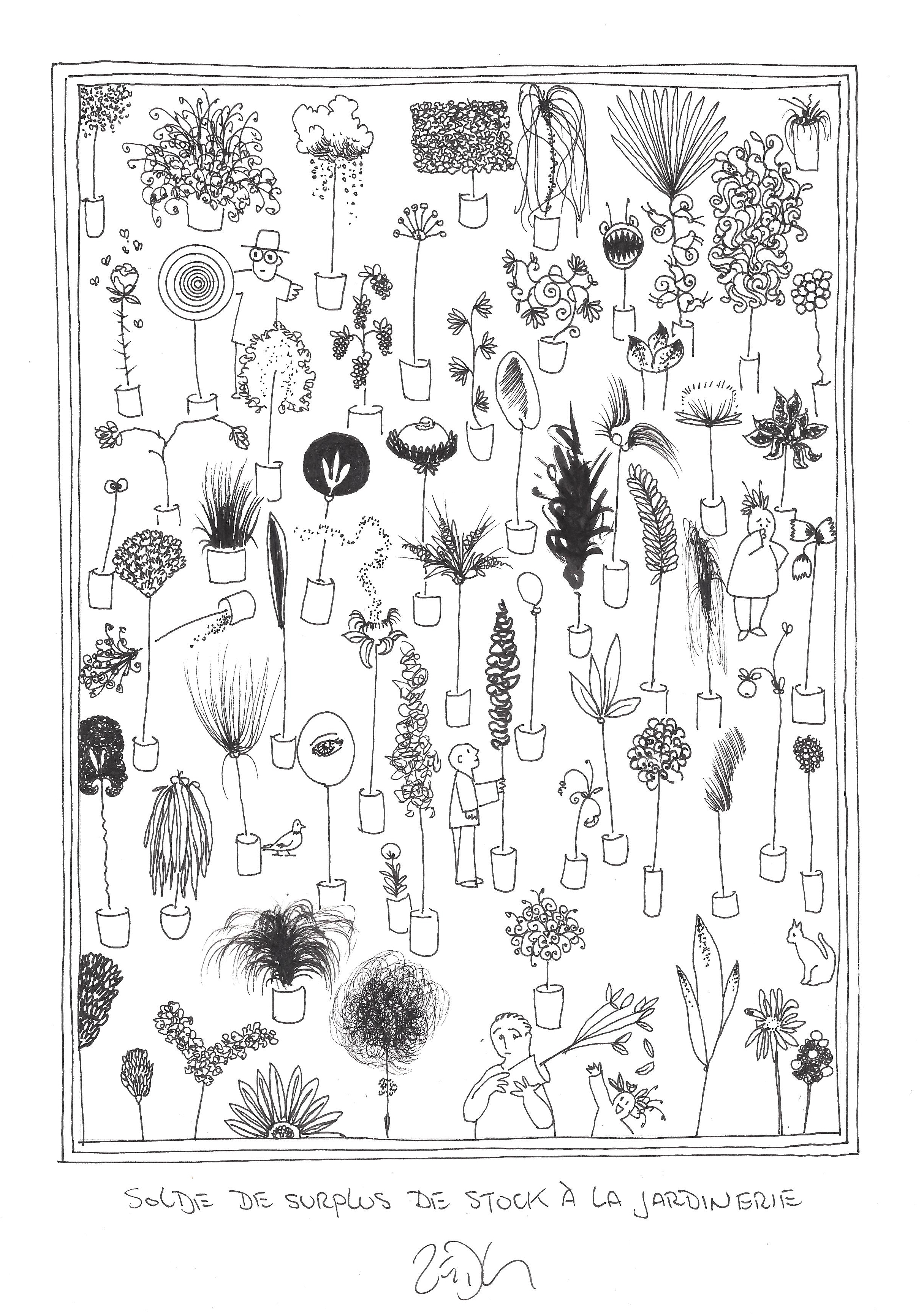 Drawing of the Day – 2754 – Dessin du jour « Garden center oversock sell-off – Solde de surplus de stock à la jardinerie » Ink on Paper – 8 x 12″ (21 x 30 cm) – Encre sur Papier