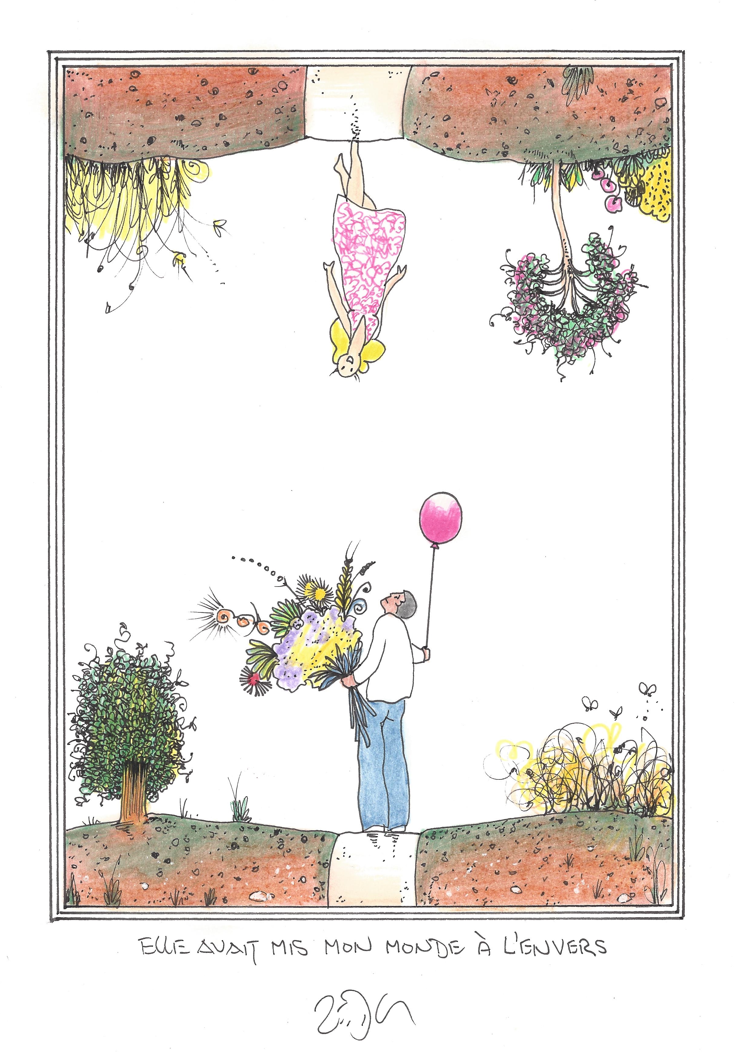 Drawing of the Day – 2755 – Dessin du jour « She had turned my whole world upside down – Elle avait mis mon monde à l’envers » Ink & colour on Paper – 8 x 12″ (21 x 30 cm) – Encre & couleurs sur Papier