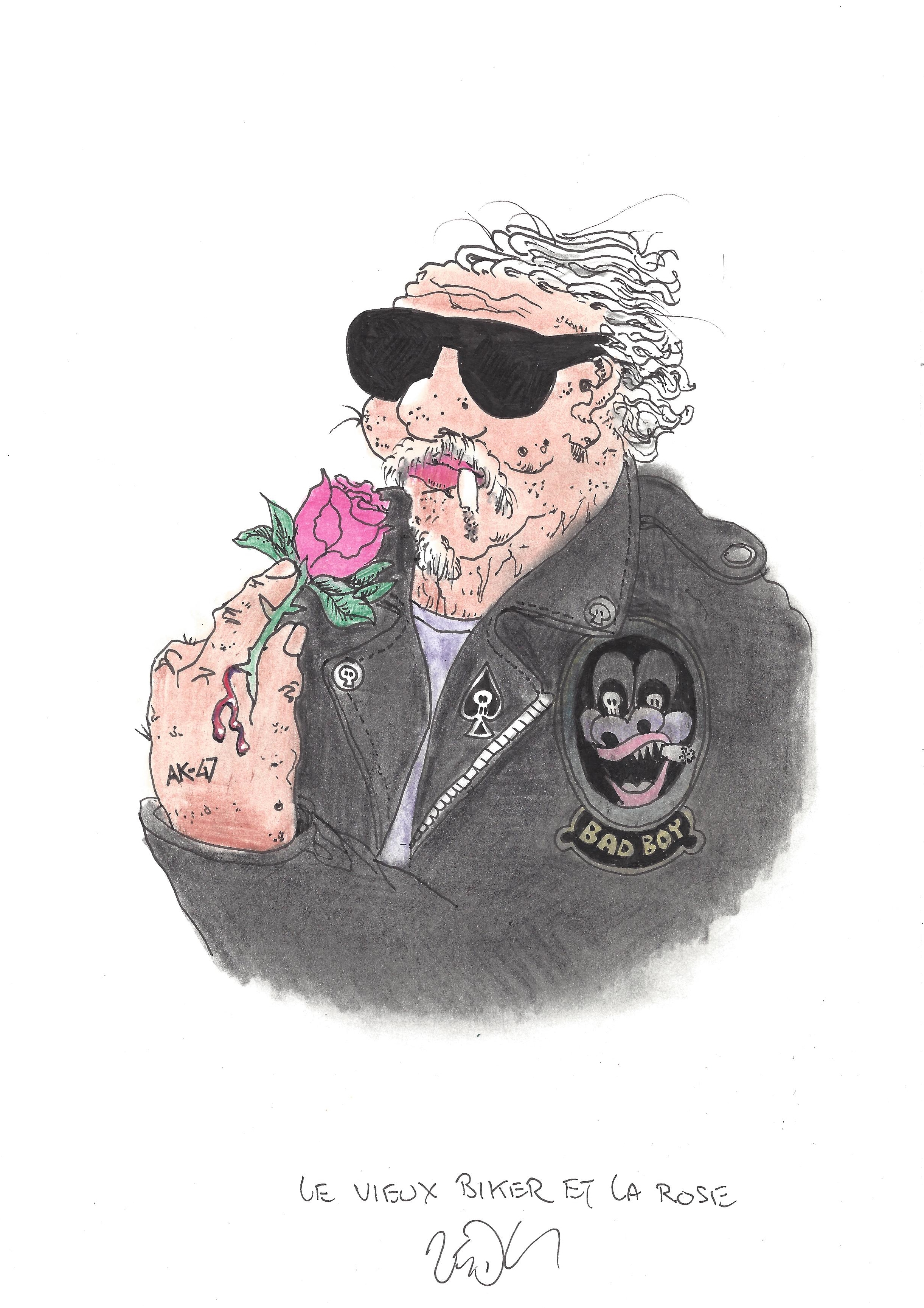 Drawing of the Day – 2756 – Dessin du jour « The old biker and the rose – Le vieux biker et la rose » Ink & colour on Paper – 8 x 12″ (21 x 30 cm) – Encre & couleurs sur Papier