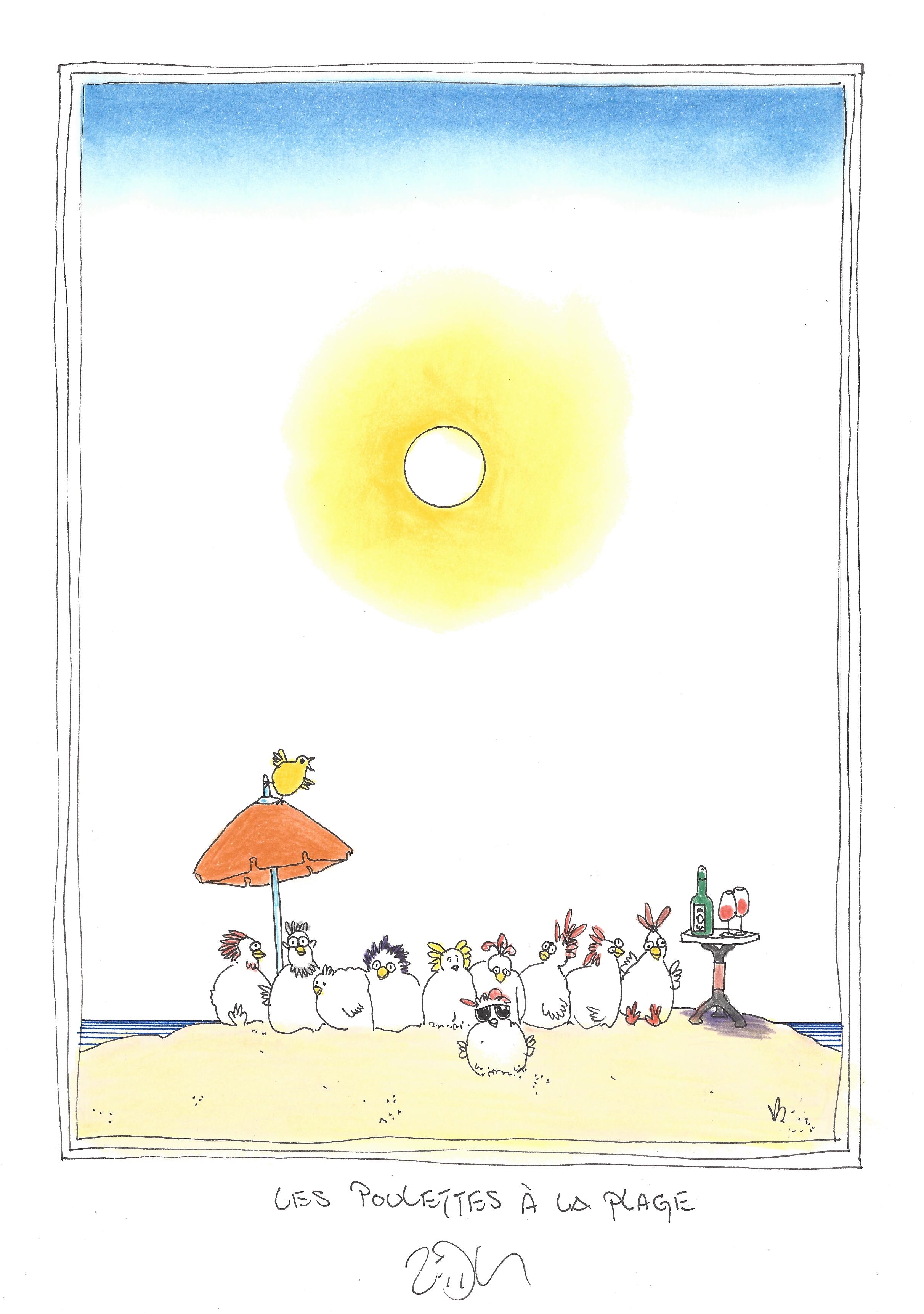 Drawing of the Day – 2757 – Dessin du jour « Chickens on the beach – Les poulettes à la plage » Ink & colour on Paper – 8 x 12″ (21 x 30 cm) – Encre & couleurs sur Papier